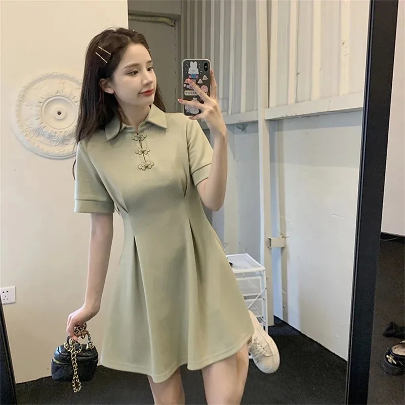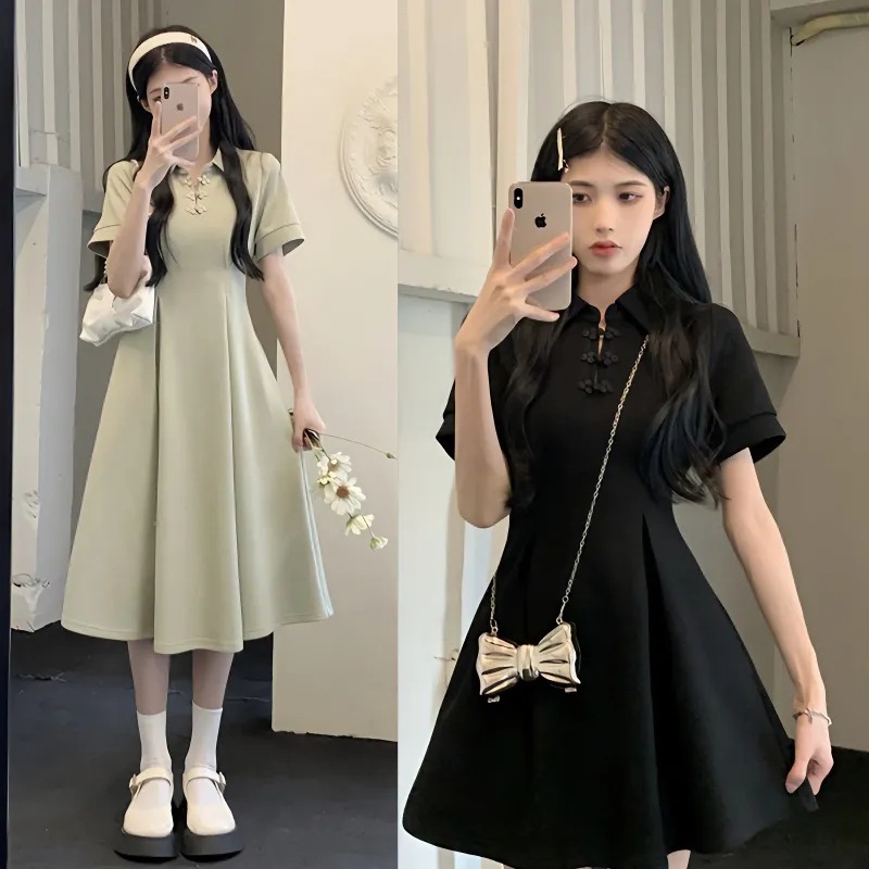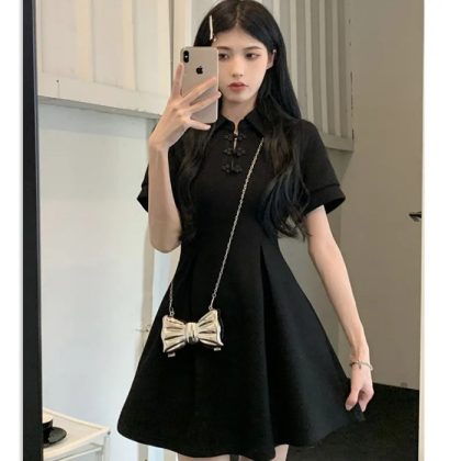 | nameOriginal | Hepburn New Chinese-style Buckle POLO Collar Black Skirt Summer plus size Short-sleeved Casual T-shirt dress Chubby Girl |