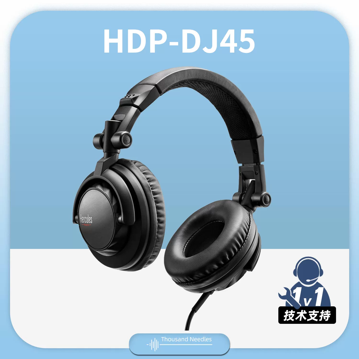 | nameOriginal | Hercules HDP DJ45 head-mounted stereo monitoring DJ mixing headphones with adapter plug  |