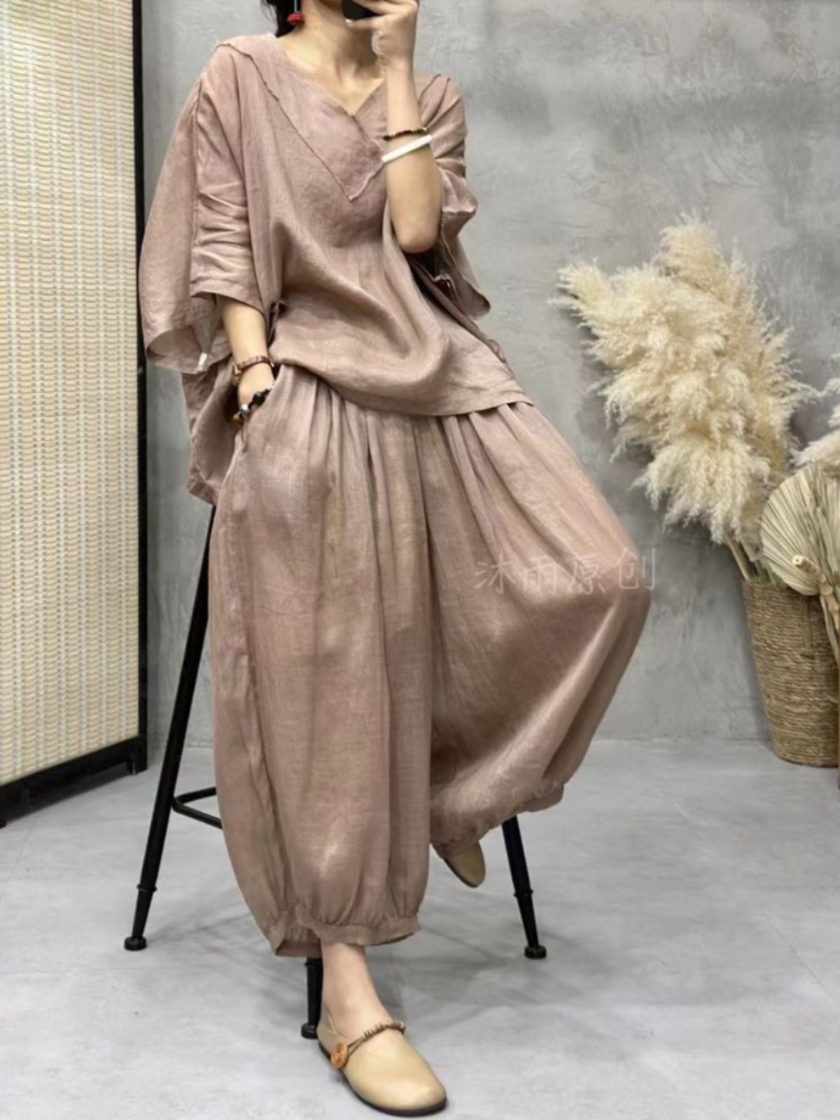 High-end bat sleeve V-neck cotton and linen casual bloomers T-shirt