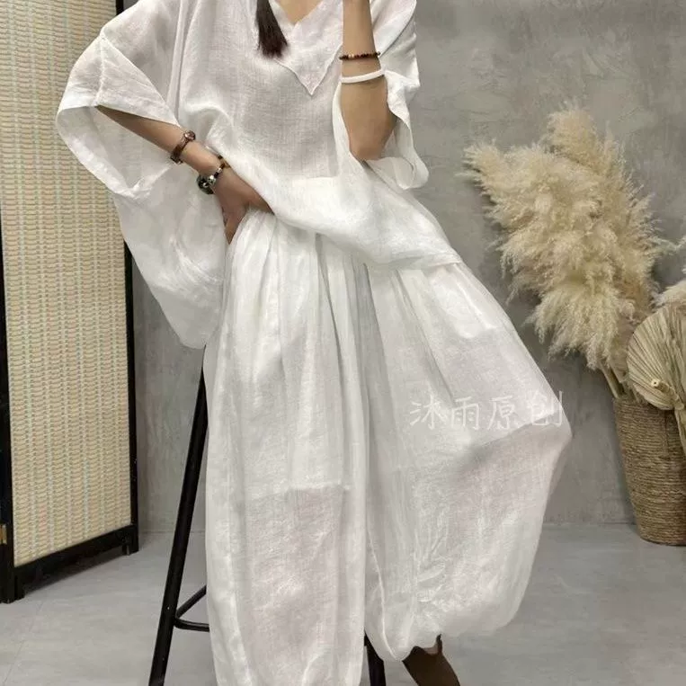 | nameOriginal | High-end bat sleeve V-neck cotton and linen casual bloomers T-shirt |