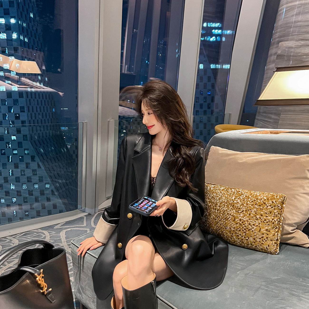 | nameOriginal | High-end black pu leather coat women's 2024 spring and autumn Korean version of loose casual design color matching suit top |