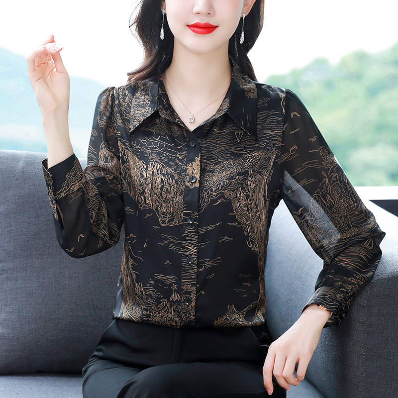 | nameOriginal | High-end Chiffon Shirt Women's Top 2024 Early Spring New Polo Collar Middle-aged Long-sleeved Printed Belly Covering Shirt Small Shirt |