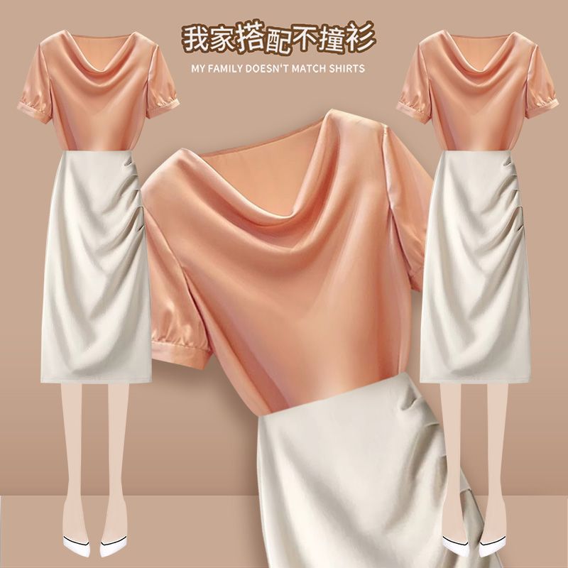 | nameOriginal | High-end Elegant Short-sleeved Satin Shirt Women's 2024 Summer High Waist Straight Foldback Bag Hip Skirt Two-piece Set |