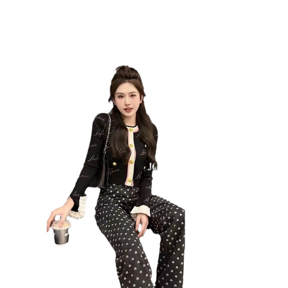 | nameOriginal | High-end European niche design heavy luxury black and white rhinestone gold buckle bell sleeve knitted cardigan top for women |
