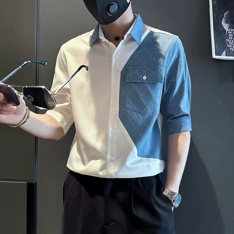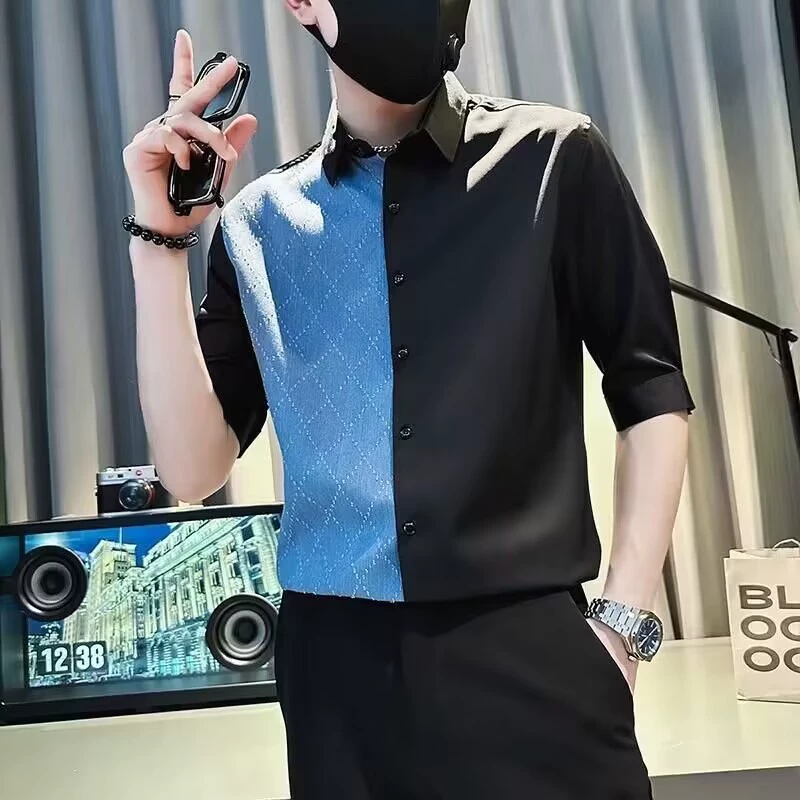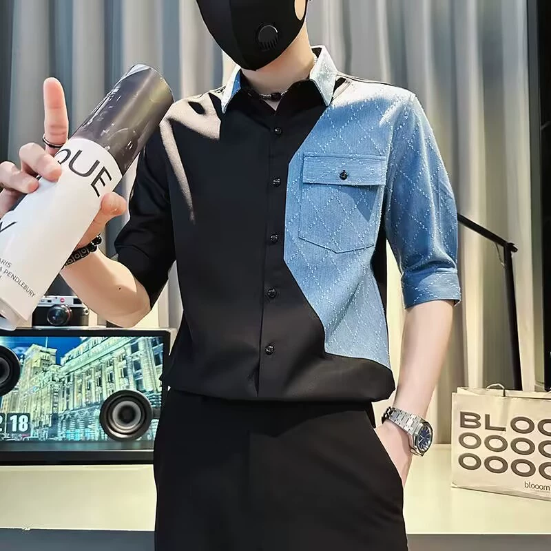 | nameOriginal | High-end five-sleeve men's spliced short-sleeved denim shirt summer trendy casual hairstylist men's tops |
