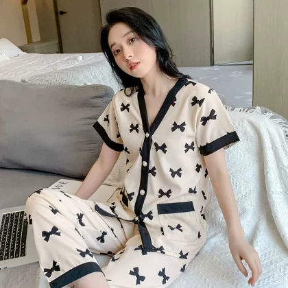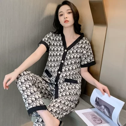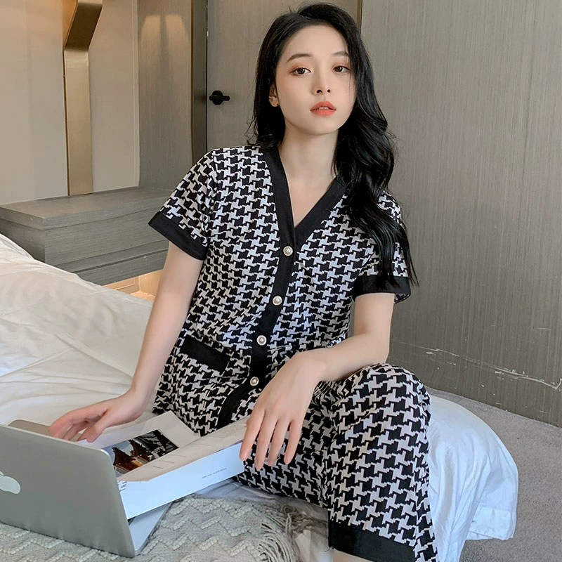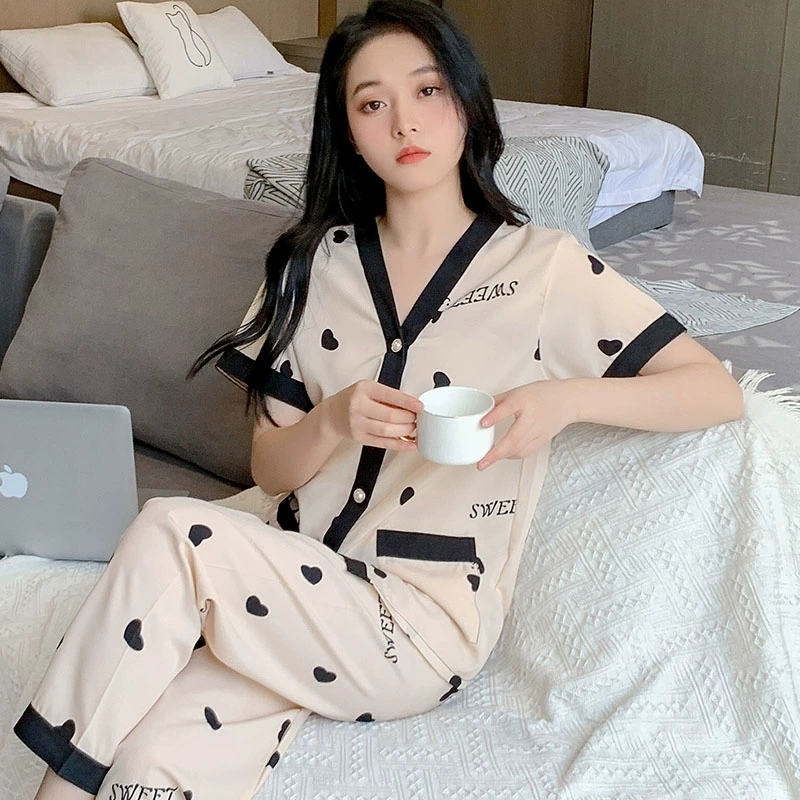 High-end ice silk pajamas for women summer cardigan short-sleeved trousers plus fat plus size sexy home wear two-piece suit