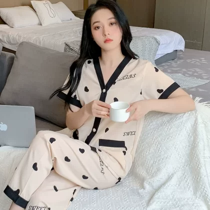 High-end ice silk pajamas for women in summer cardigan short-sleeved trousers plus fat plus size sexy home clothing two-piece set