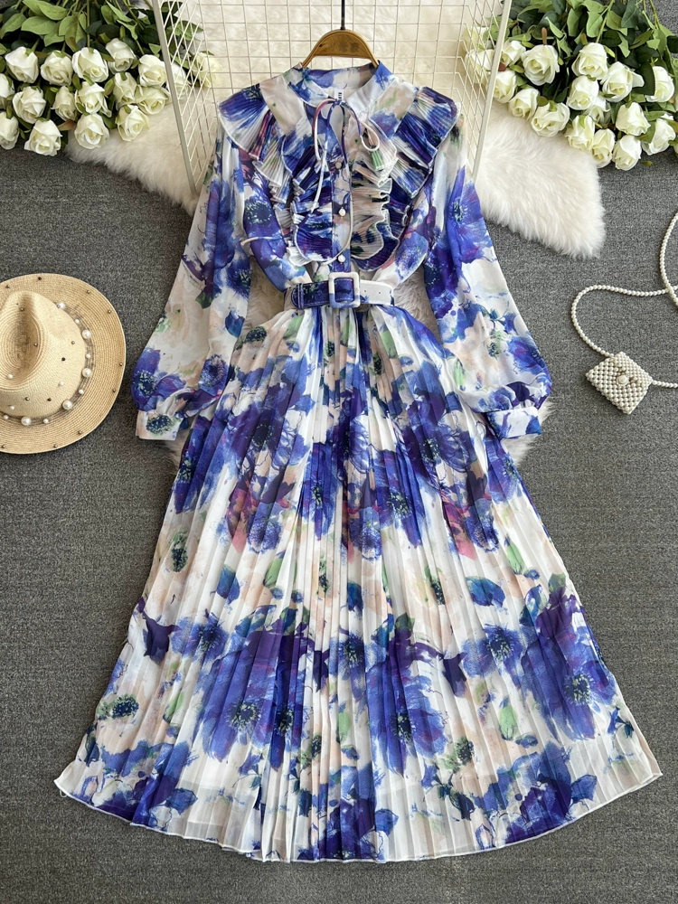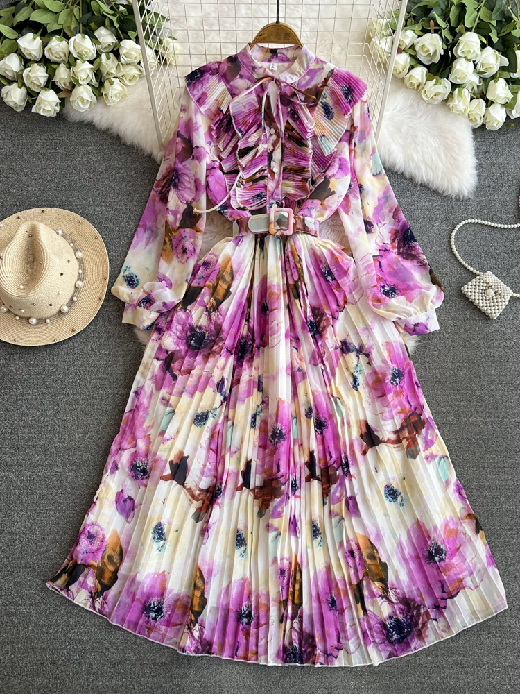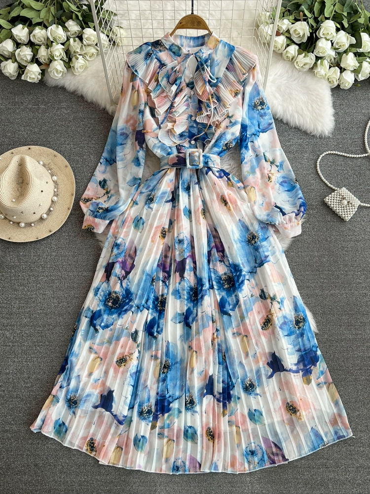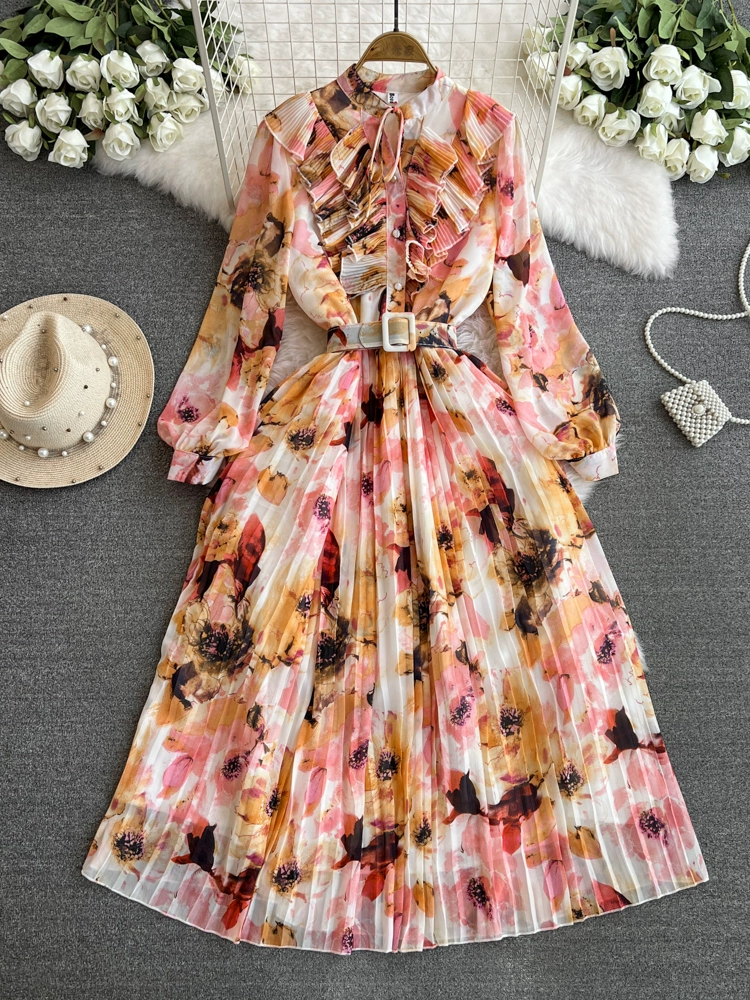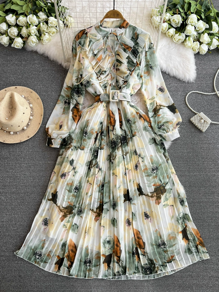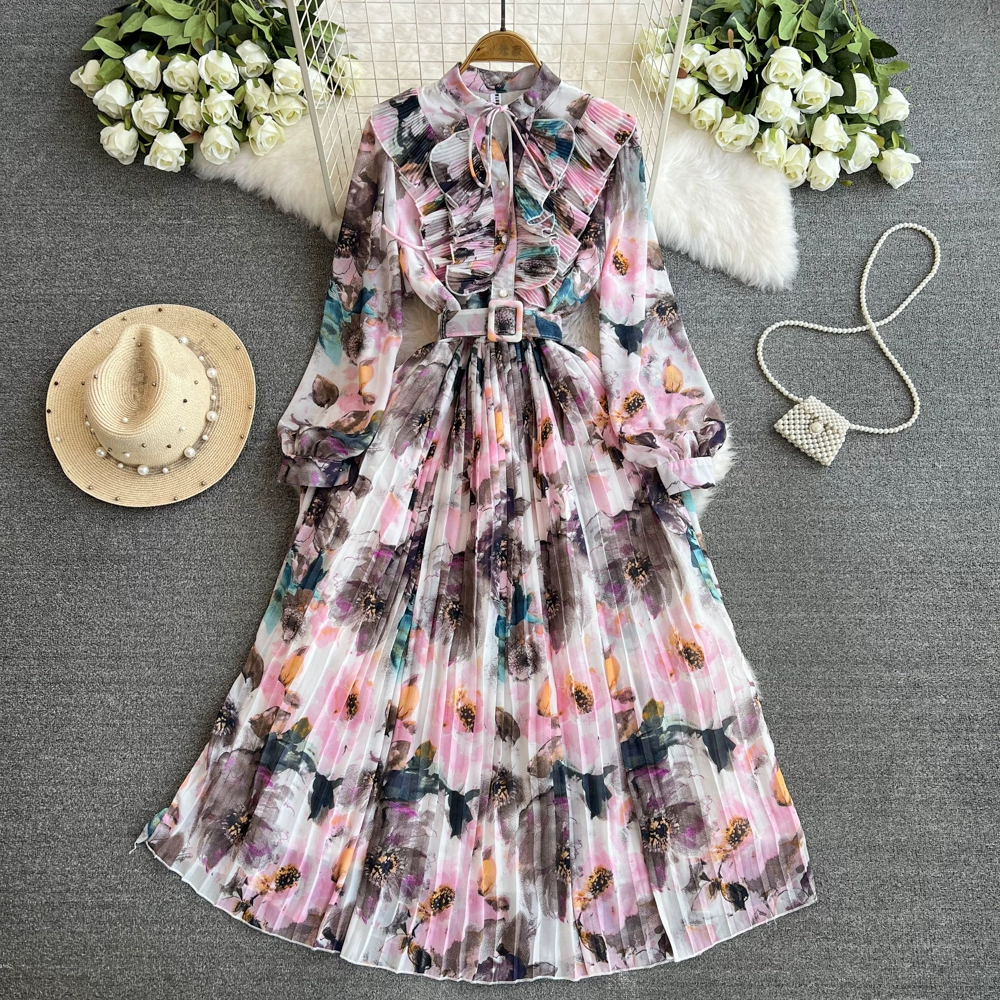 High-end retro style stand-up collar long-sleeved waist slimming printed pleated dress elegant large hem mid-length skirt for women