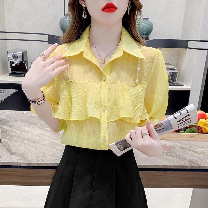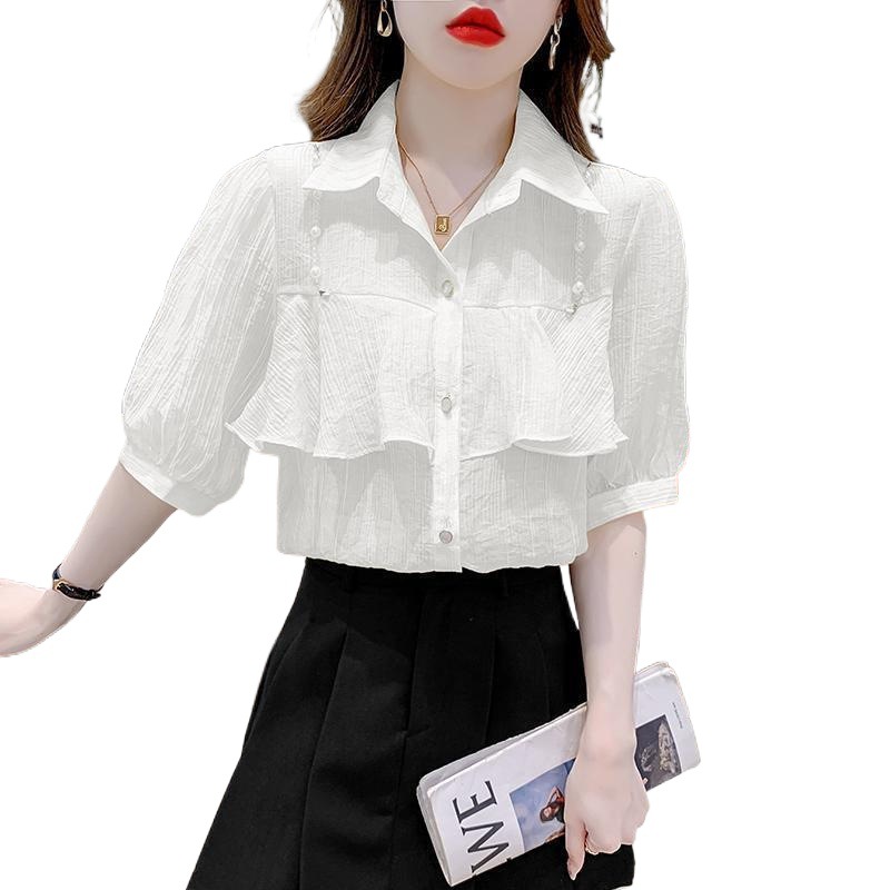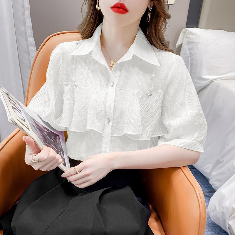 High-end Ruffled White Short-sleeved Shirt Women’s Summer Design Sense Niche French Stylized Age-reducing Chiffon Top