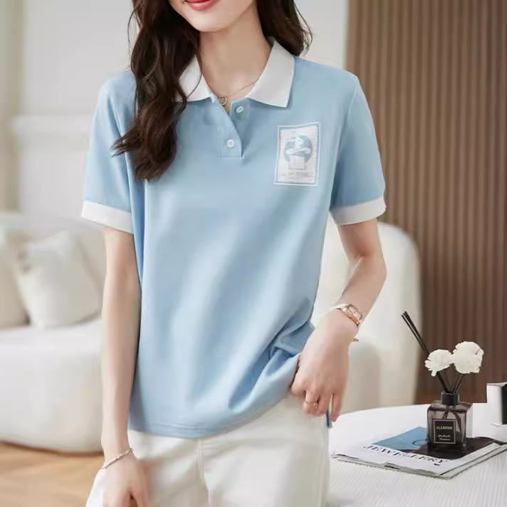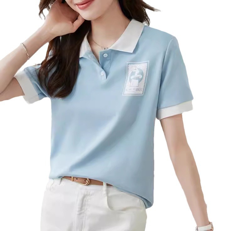 High-end Sense Contrast Color Polo Shirt 2024 Summer Korean Style Fashion College Style All-match Age-reducing Loose Short-sleeved T-shirt for Women