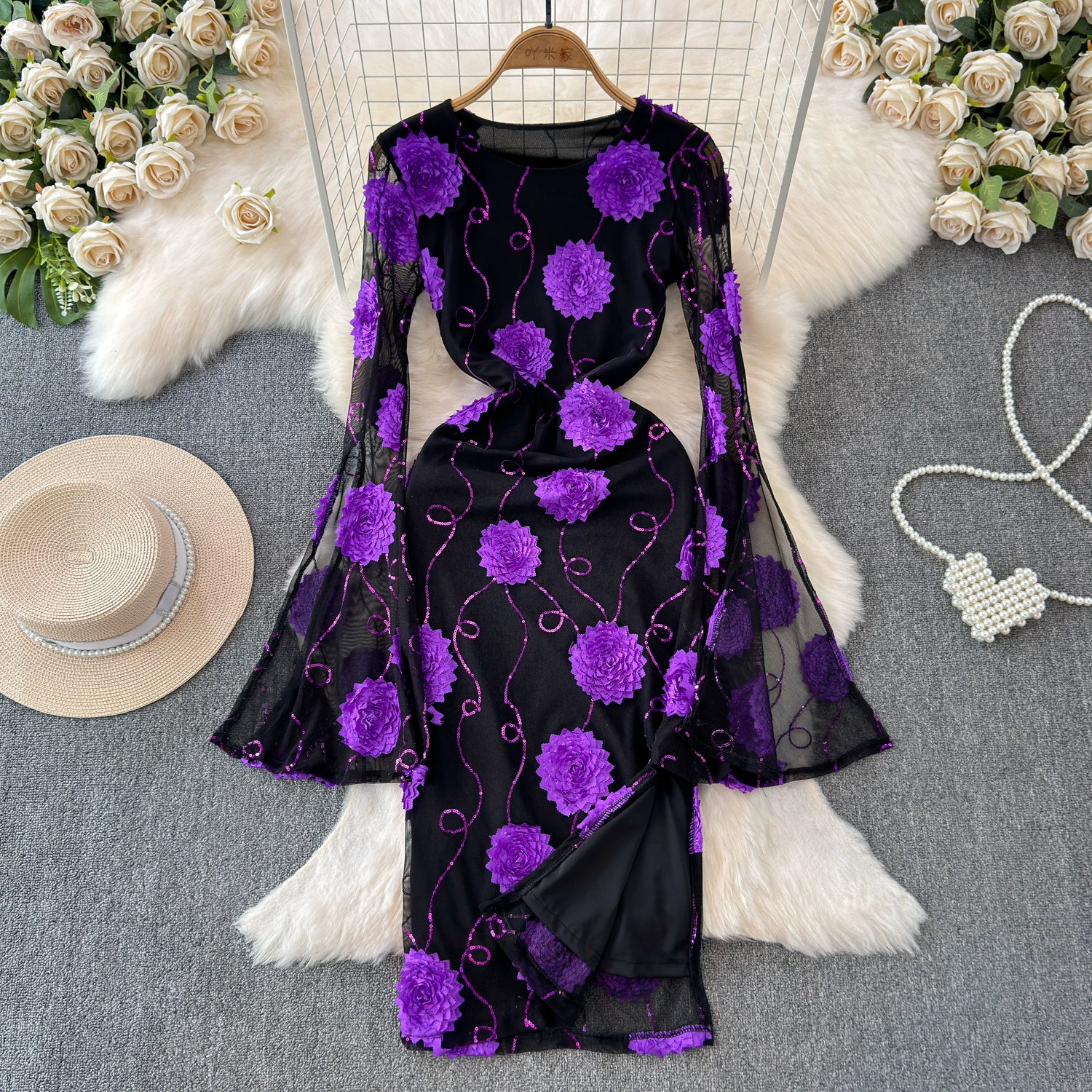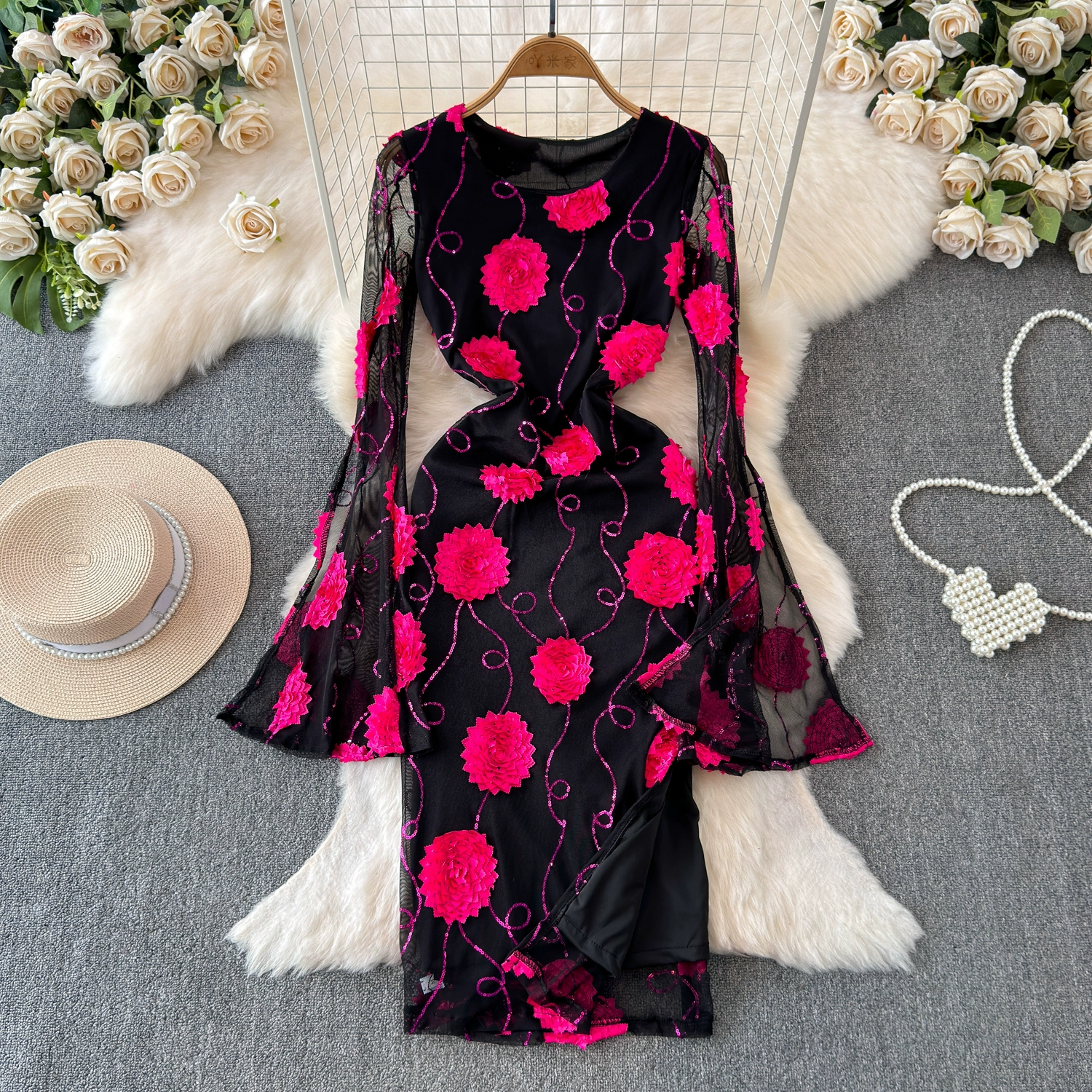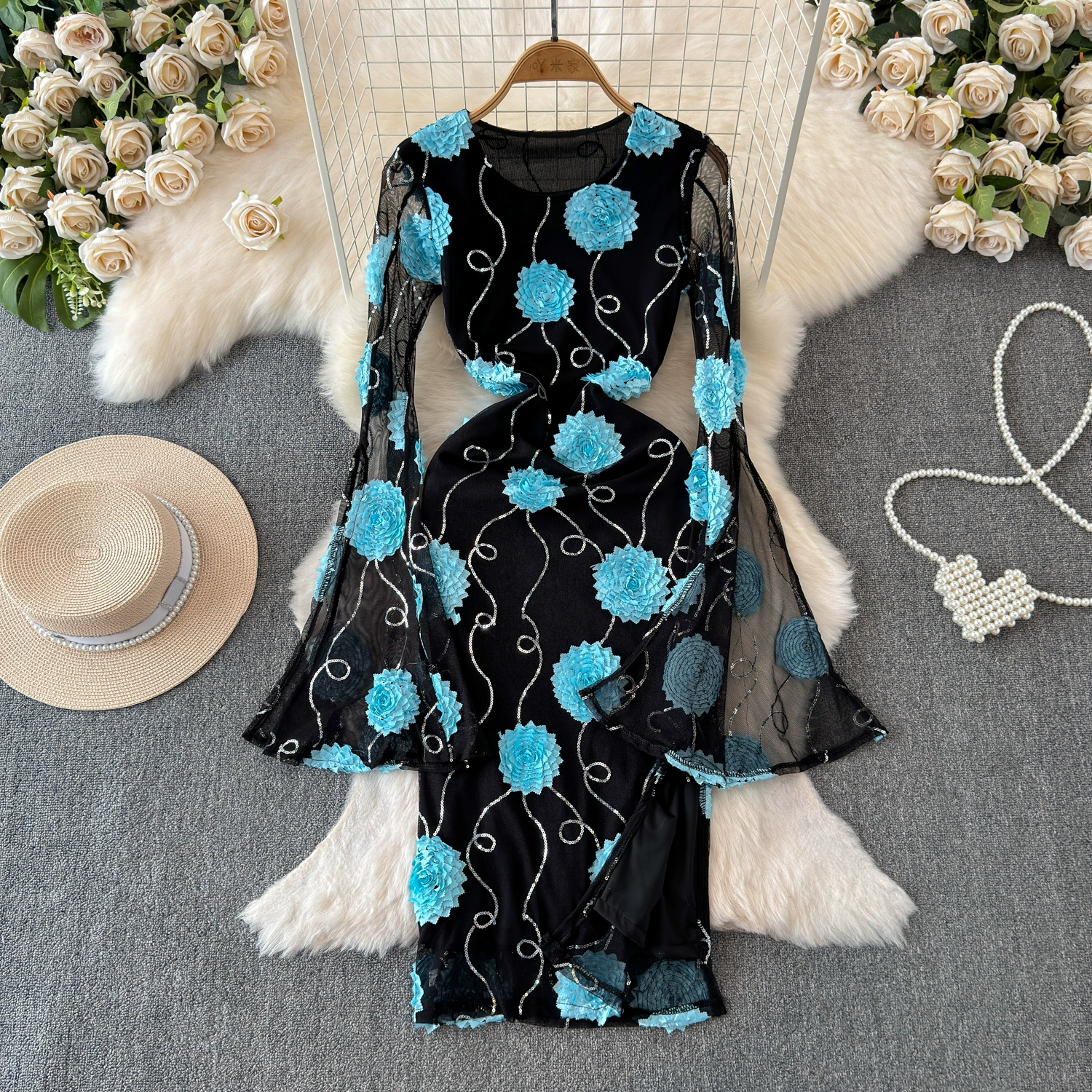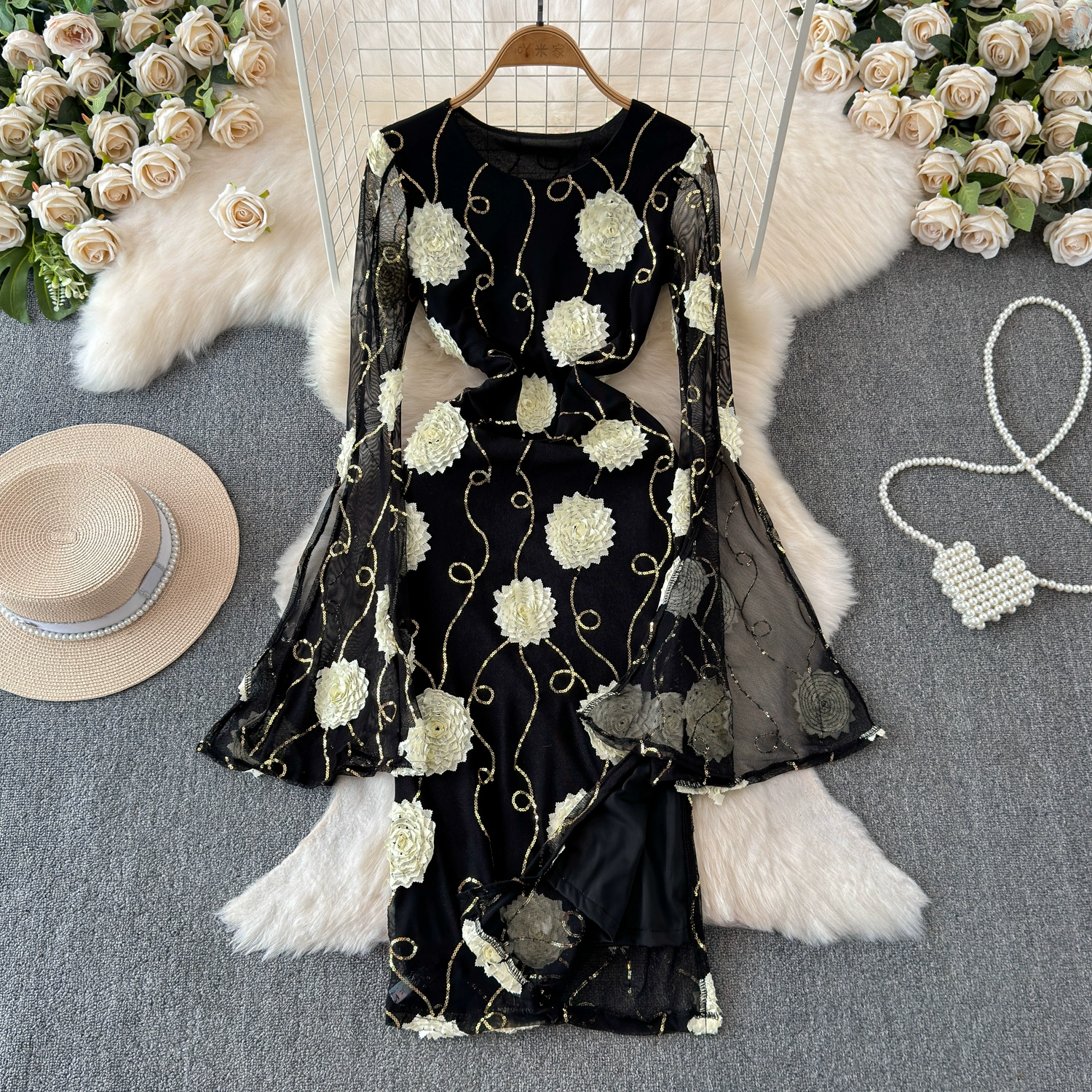 | nameOriginal | High-end small dress, hip-hugging long skirt, new spring flower waist, trumpet sleeves, casual temperament dress |