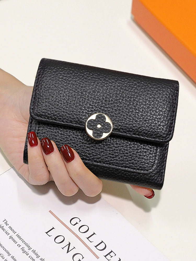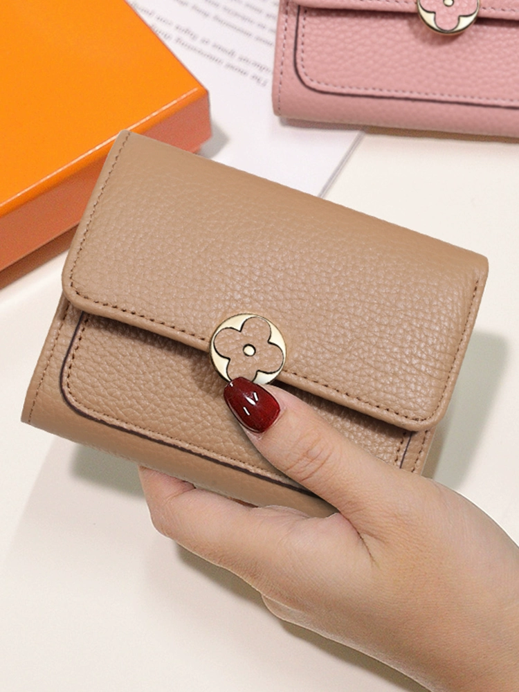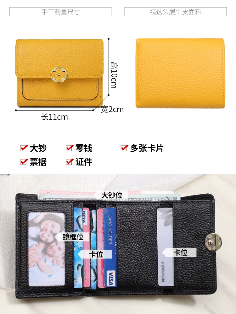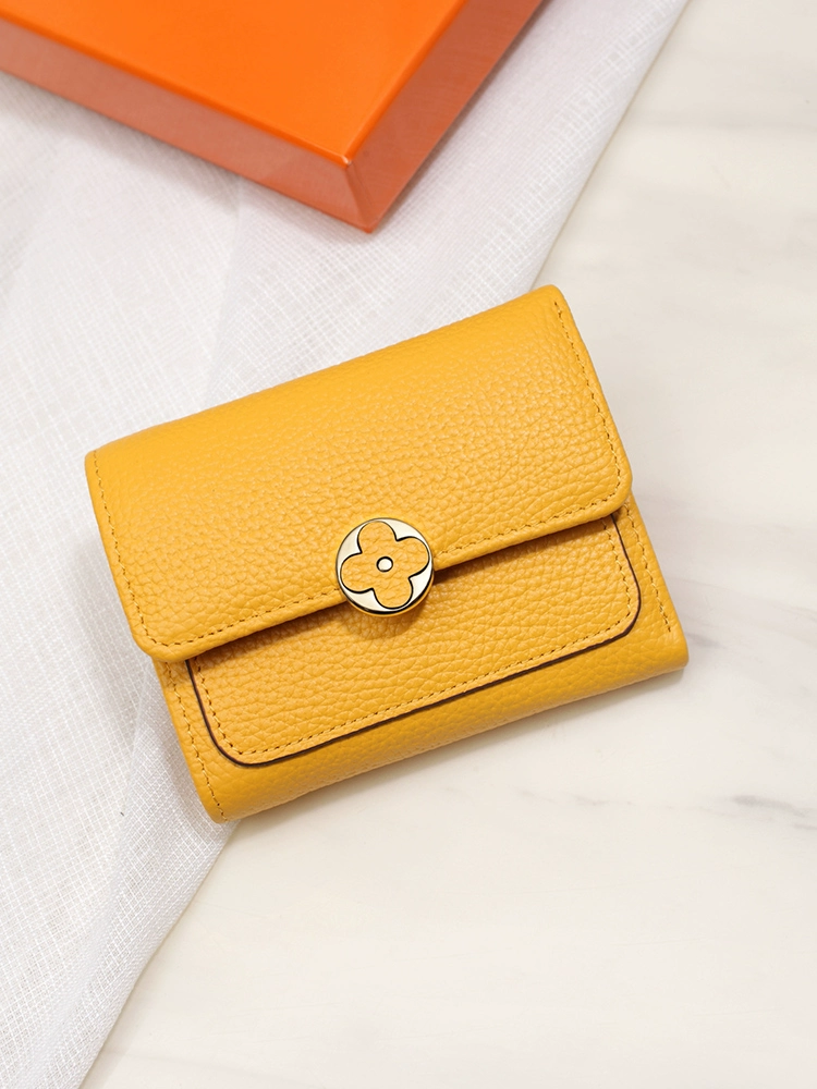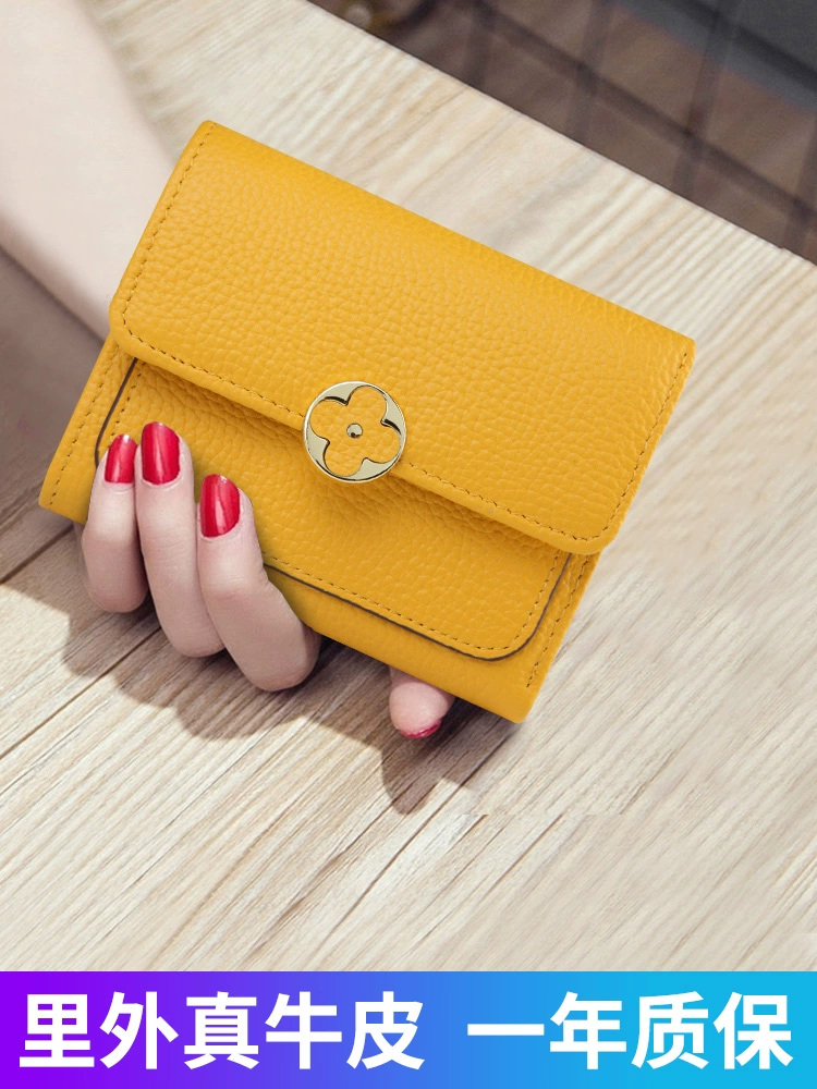 High-end yellow lucky genuine leather short wallet for women 2024 new fashion four-leaf clover wallet soft cowhide small wallet