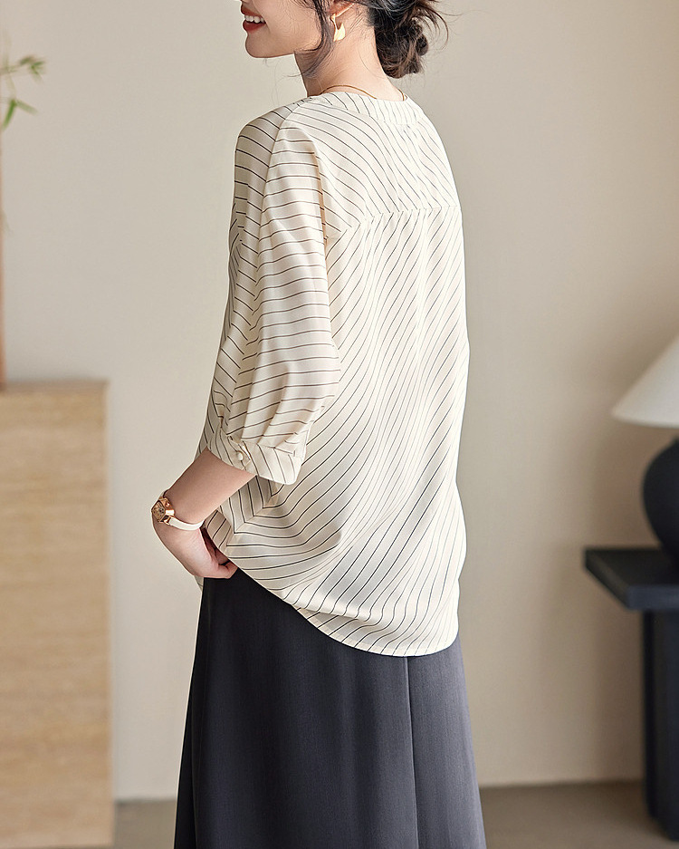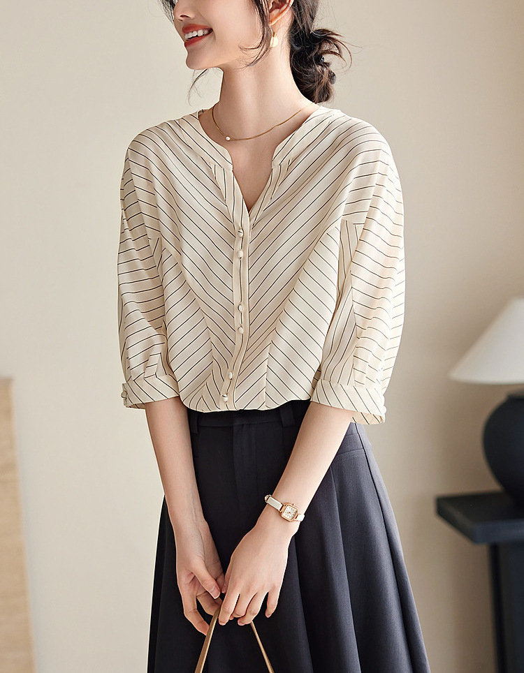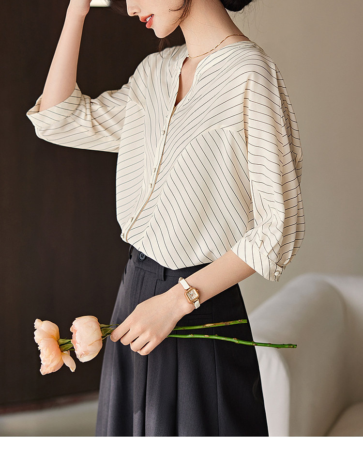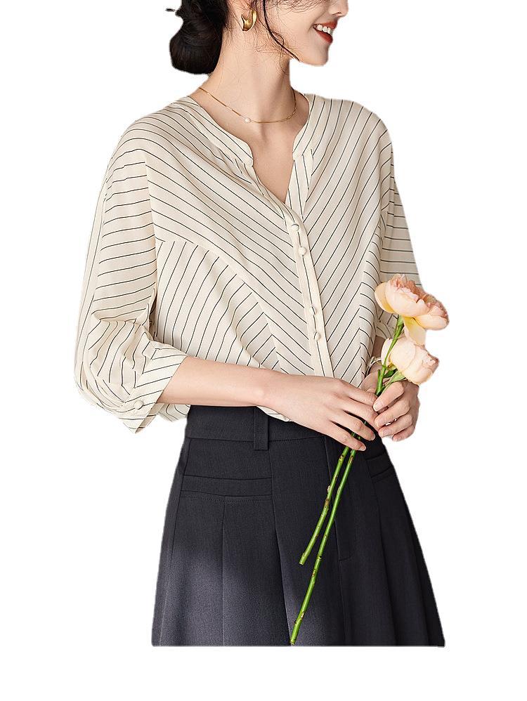 | nameOriginal | High-grade Striped V-neck Shirt Women's 2024 Summer Elegant Elegant Shirt Commuting Simple Half-sleeve Top Clothes |