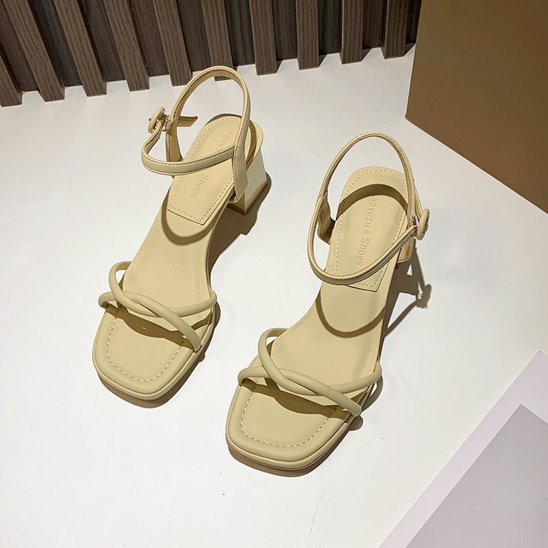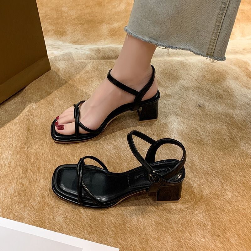 High Heels Sandals Women's 2024 New Summer Thick Heel Fashionable One-word Belt French Matching Skirt Mid-heel Elegant Square Heel