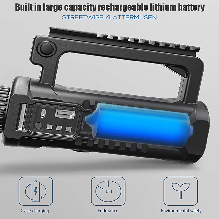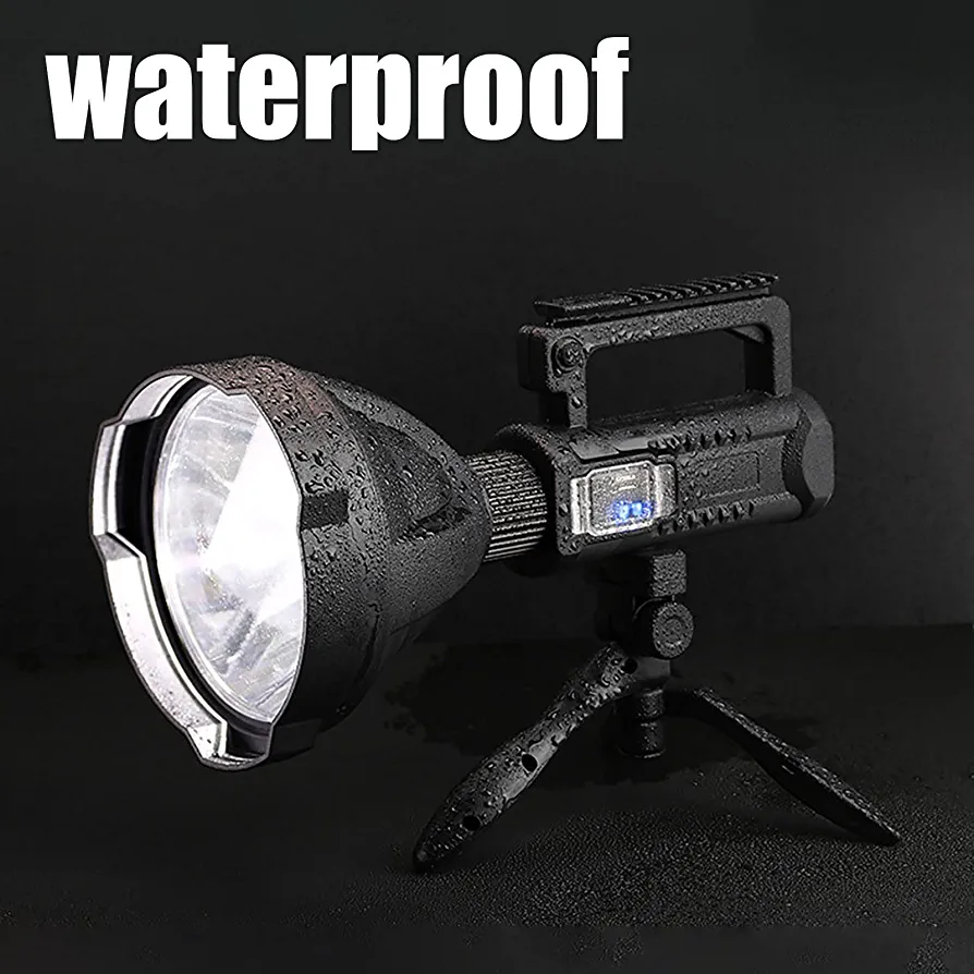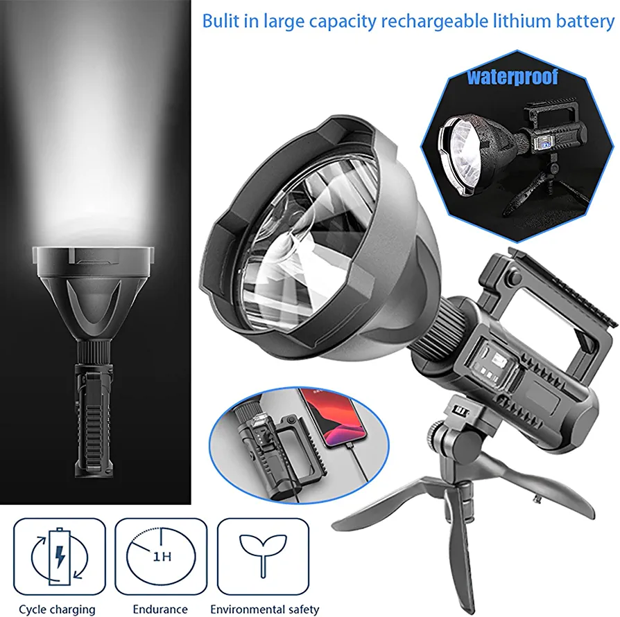 High-lumen USB rechargeable flashlight with 1200mAh battery, tripod, and 4 lighting modes. Waterproof and portable for outdoor camping and home use.