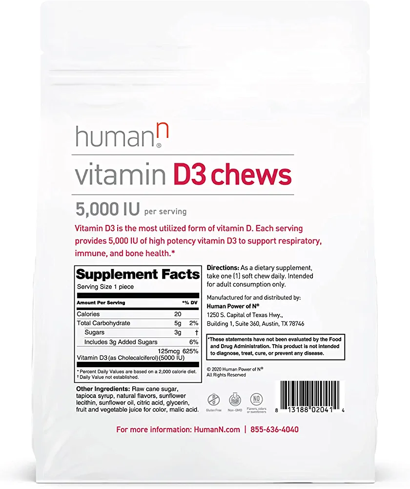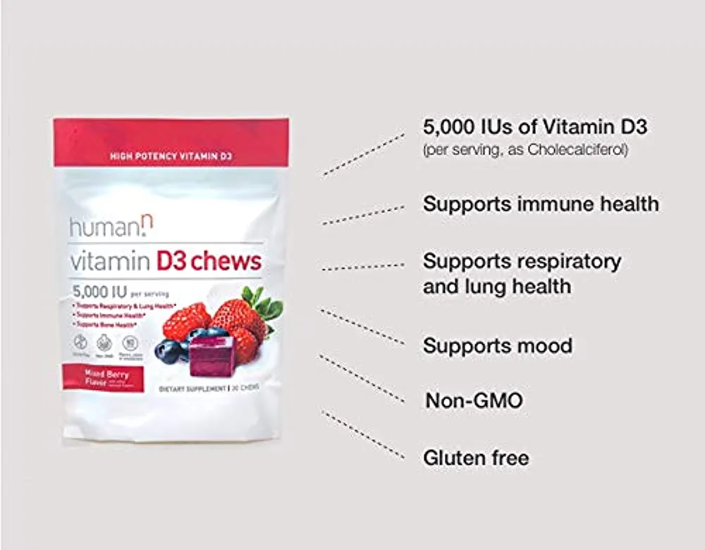 | nameOriginal | humanN Vitamin D3 Chews – High Potency Vitamin D3 5000iu (125mcg) Helps Support Healthy Mood, Immune Support, Respiratory Health & Bone Health, from Maker of SuperBeets, Mixed Berry Flavor, 30-Count |