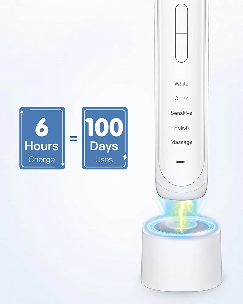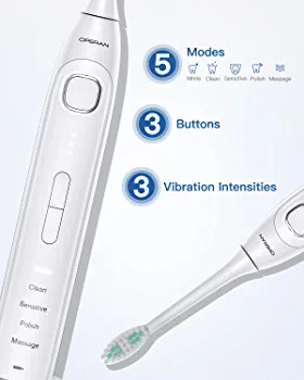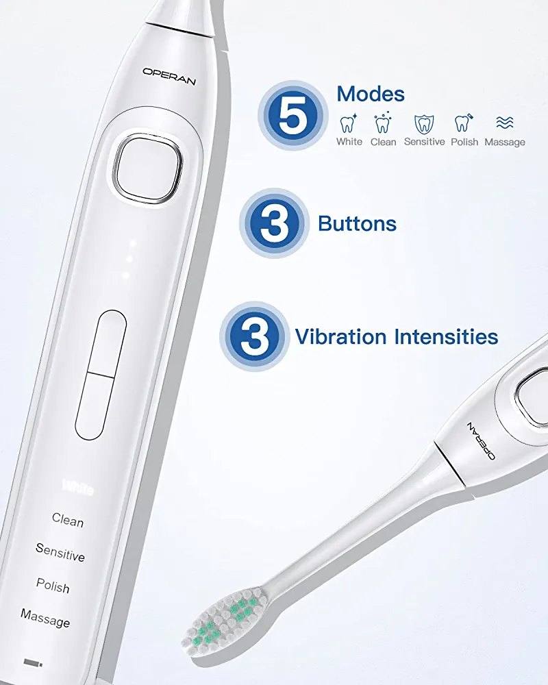 This electric toothbrush for adults offers 5 different brushing modes and 3 intensity levels to cater to your specific needs. The White mode is designed to whiten teeth, Clean mode is for daily cleaning, Sensitive mode is for those with sensitive gums or teeth, Polish mode smooths and brightens teeth, and Massage mode improves gum health. Each mode has 3 intensity levels, allowing you to personalize your brushing experience.