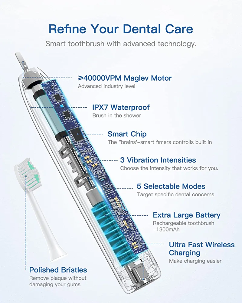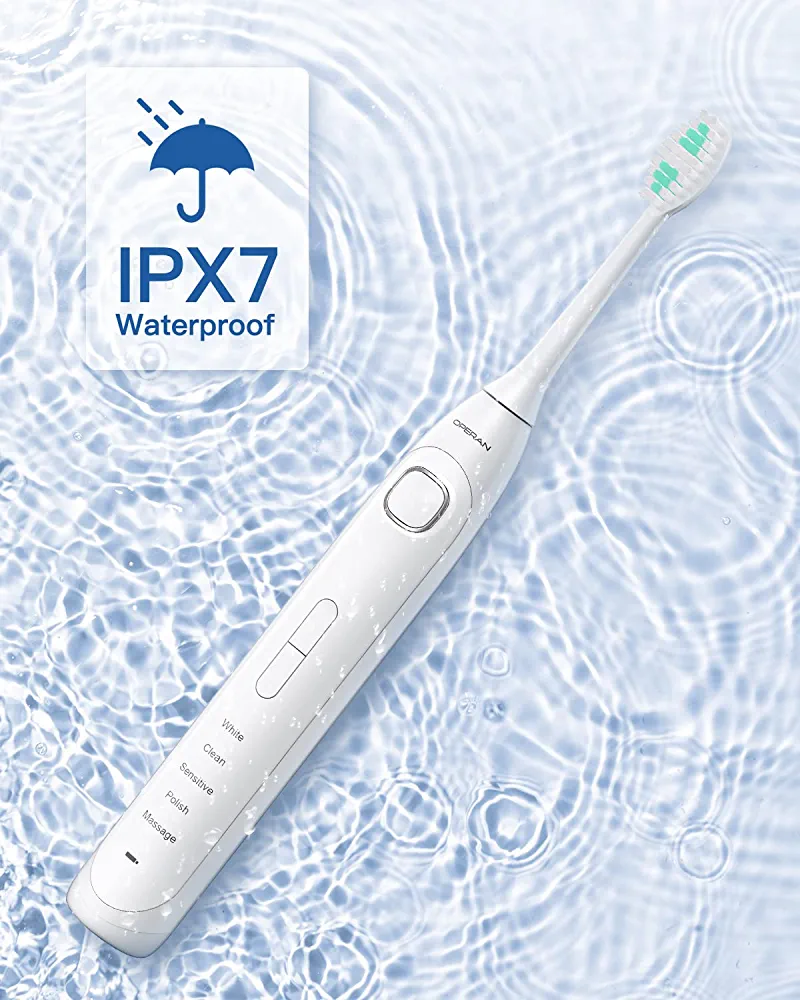 With up to 40,000 VPM high vibration sonic technology, this toothbrush can remove up to 99.99% of plaque and stains for a deep clean along the gumline and between teeth. It also boasts a 100-day battery life and is IPX7 waterproof, allowing for use in the shower or bath.
