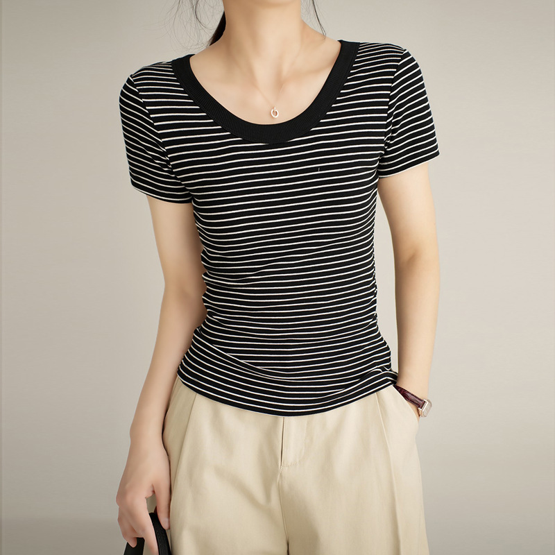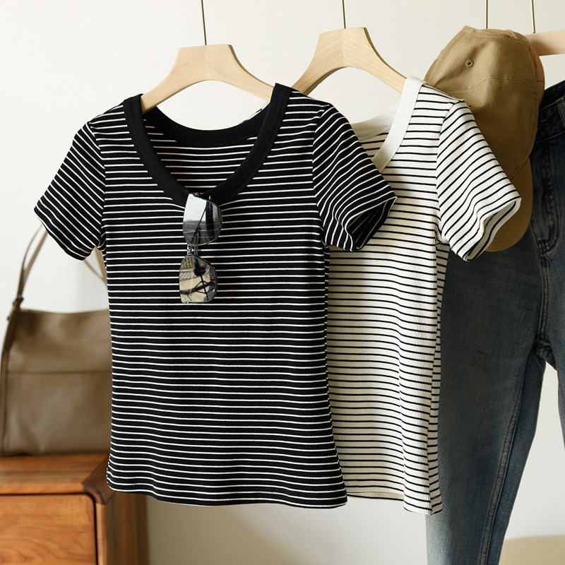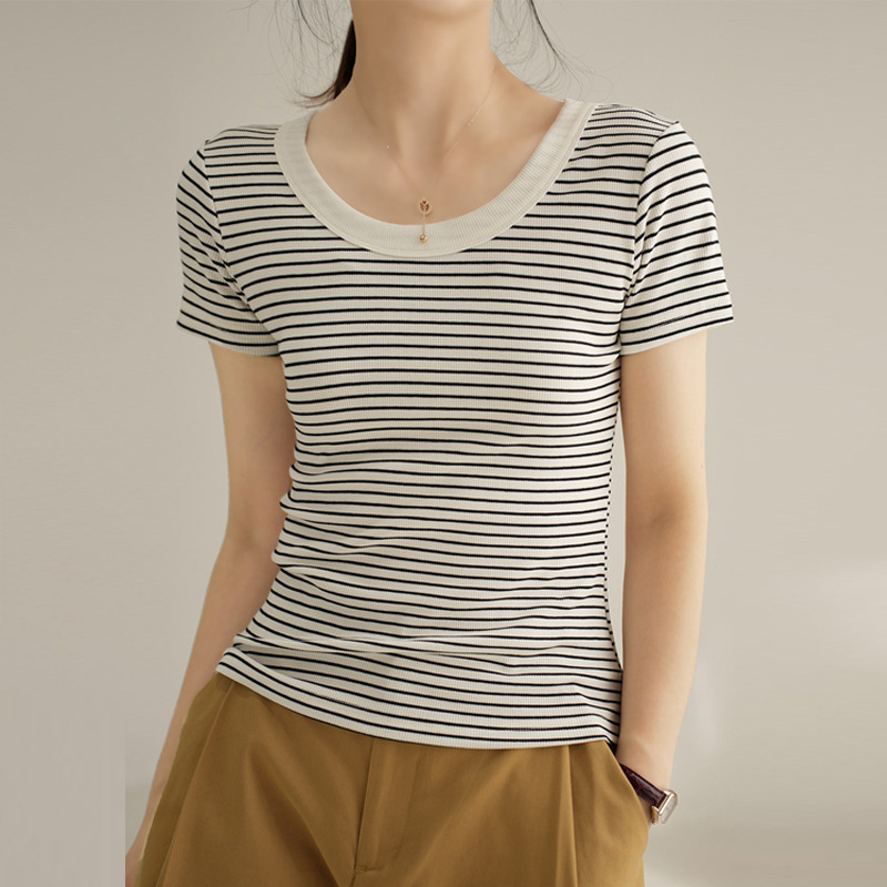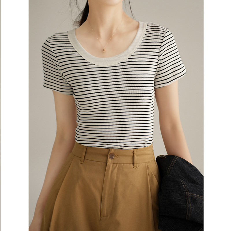 high quality Striped T-shirt Women’s Cotton 2024 Summer New Slim-fit Slimming All-match Round Neck Short-sleeved Top Base Shirt