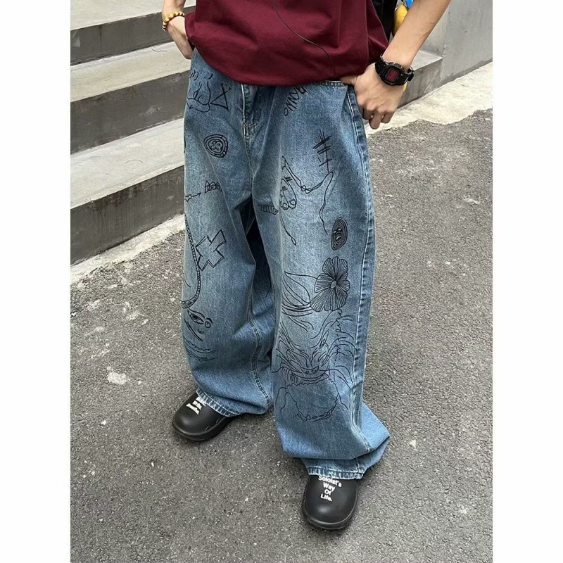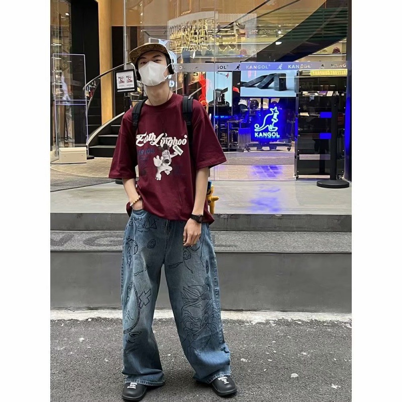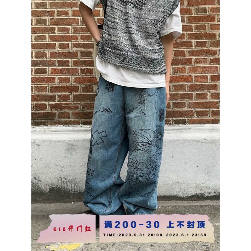 High street ankle-tied Denim pants loose casual straight men’s ins side stitching rope 2024 Hong Kong style new