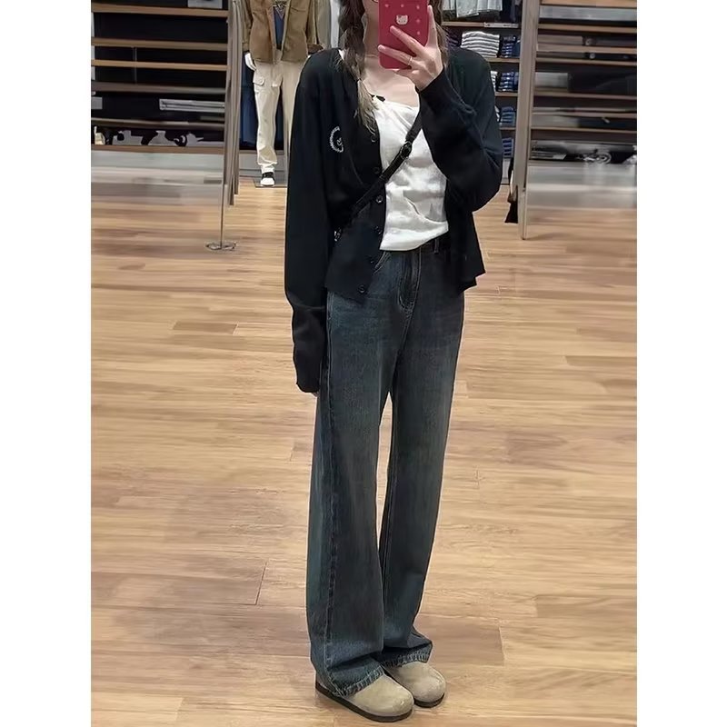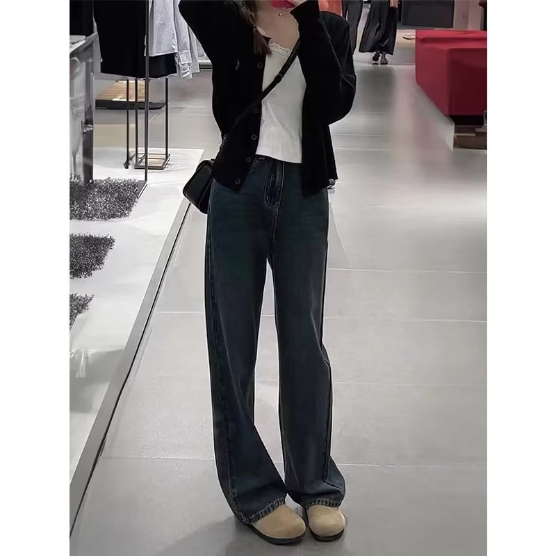 High Street Vintage Washed dark blue Jeans Women's Summer All-match Straight Pants Loose Wide-leg Pants Women's Jeans