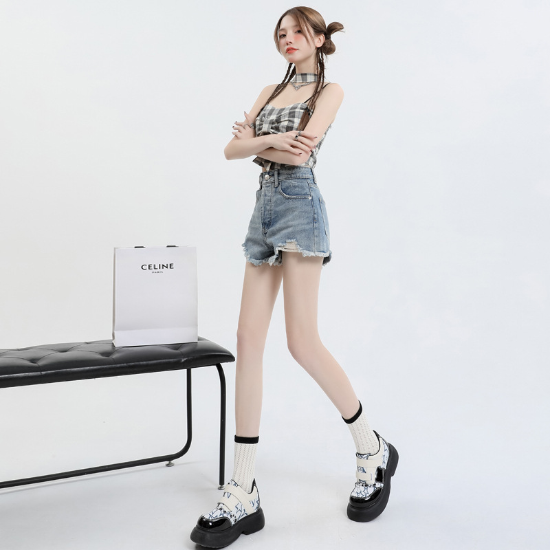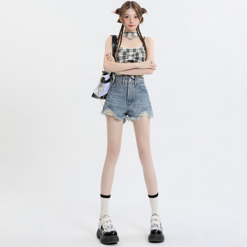 High waist Denim shorts for women 2024 spring new high waist slimming small frayed A- line loose wide leg pants