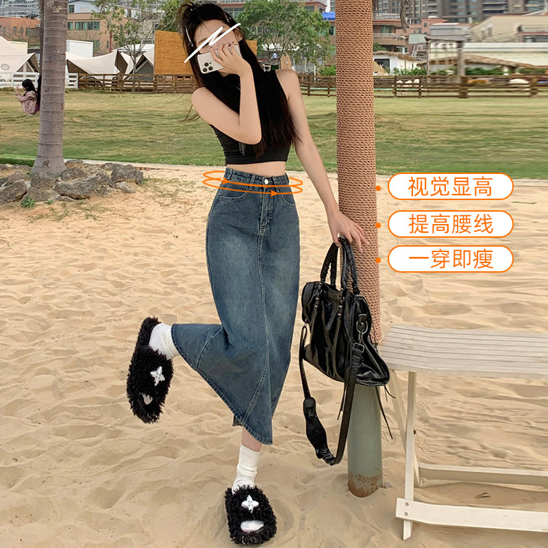High Waist Split Denim Skirt Women's 2024 New Summer Small A- Line Skirt Retro Hip Long Skirt