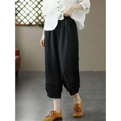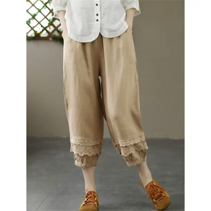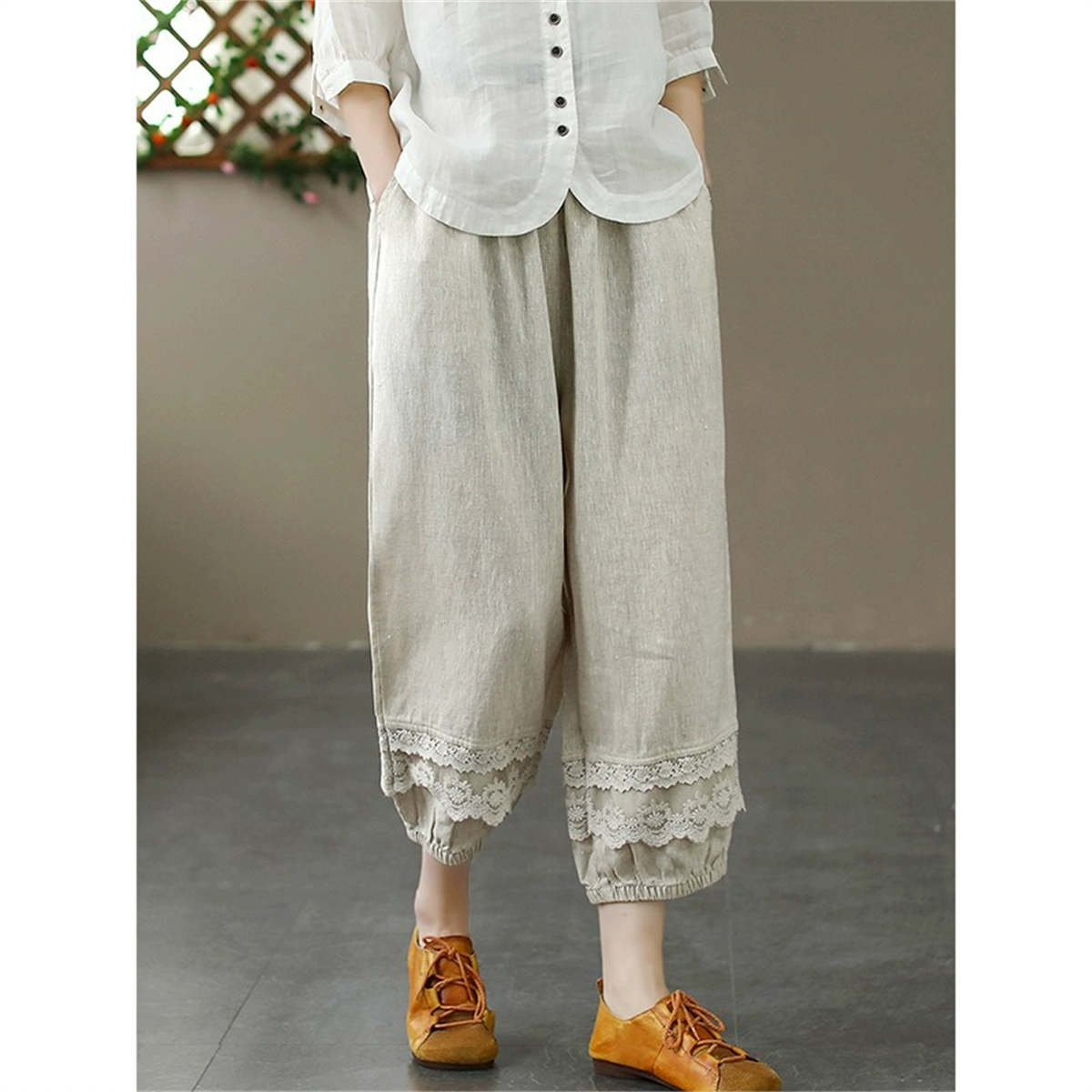 High-waisted draped cotton and linen lace patchwork loose harem pants