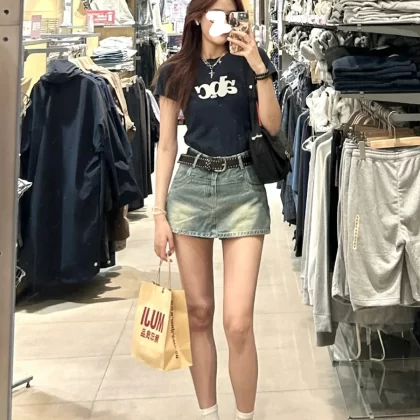 High-waisted summer A-line hip-hugging denim skirt for petites