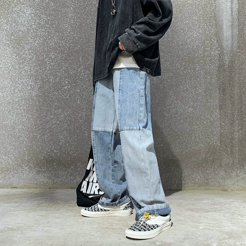 Hip-hop European and American style distressed patchwork contrasting color jeans
