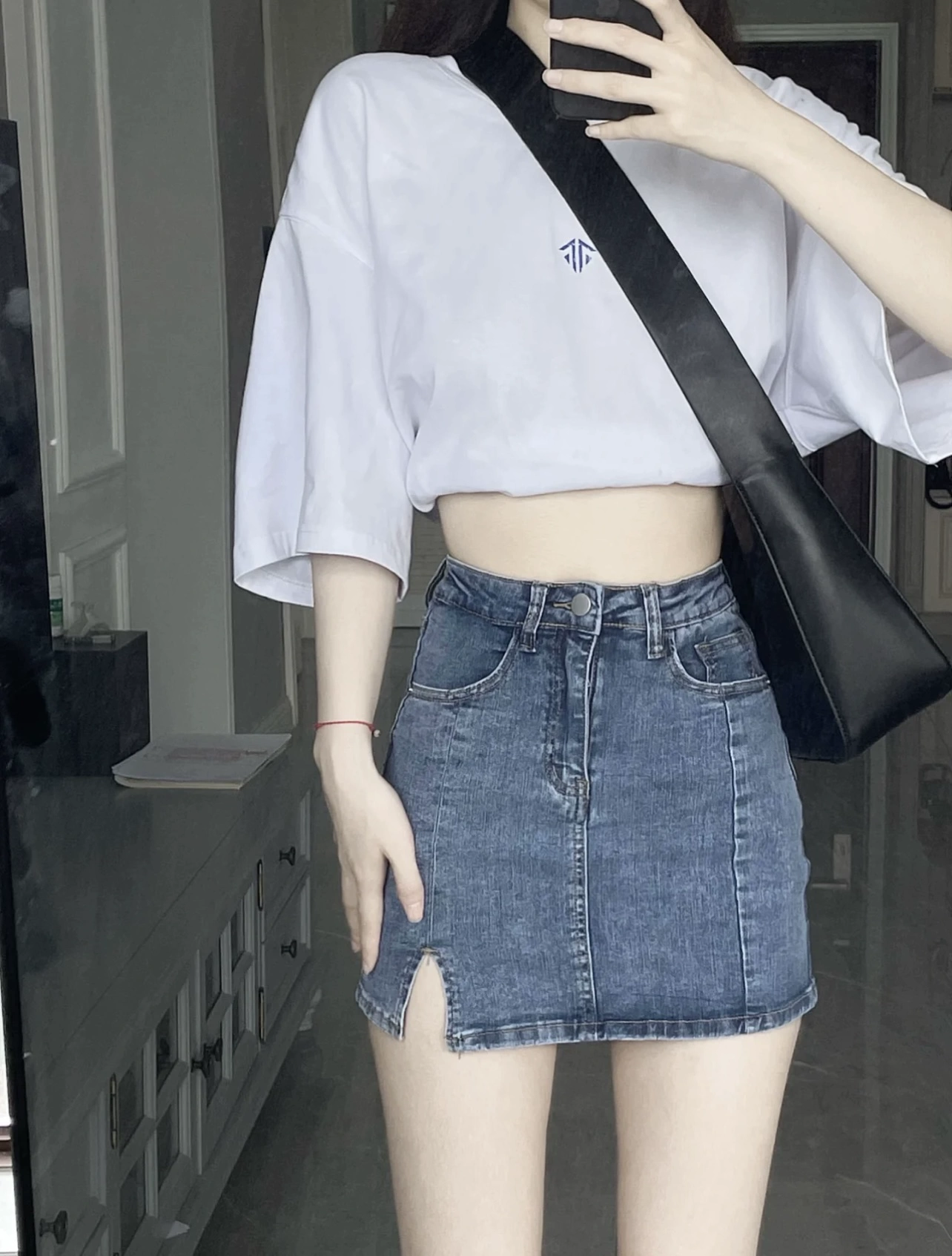 | nameOriginal | Hip-hugging stretchy high-rise denim skirt for small people |