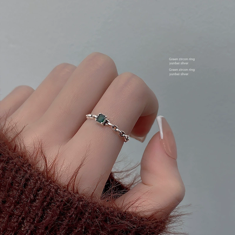 | nameOriginal | Hollow chain geometric S925 silver ring for women retro fashion green zircon open ring temperament index finger ring trendy |