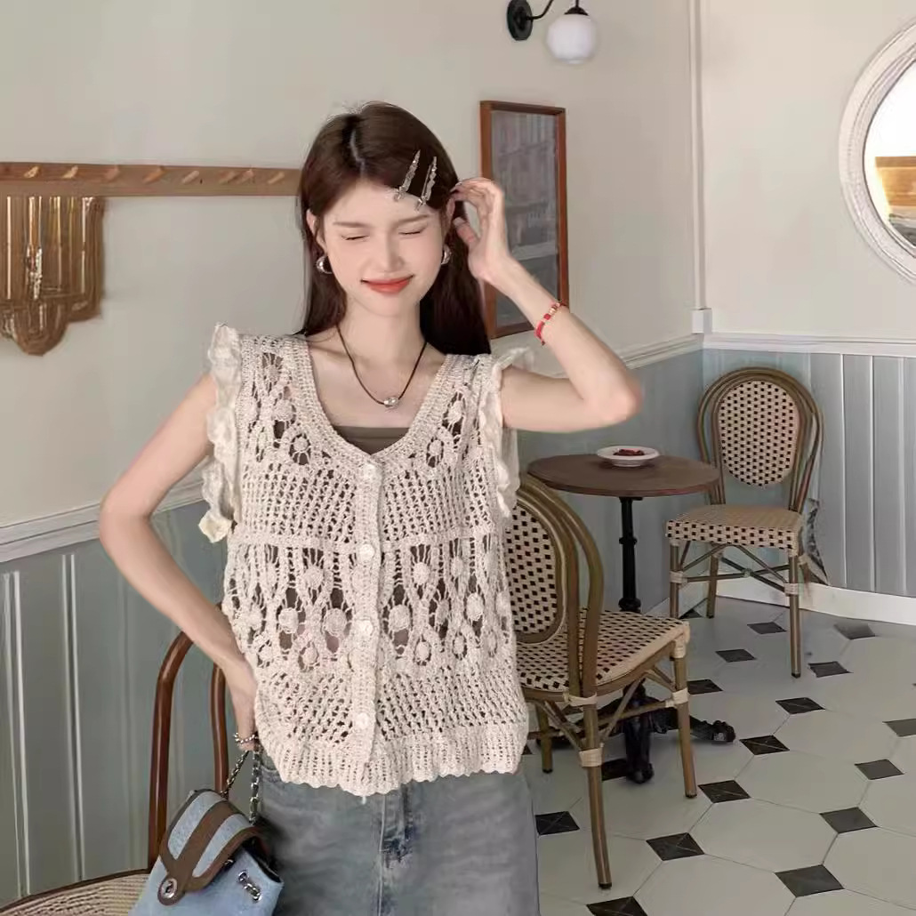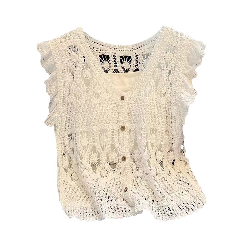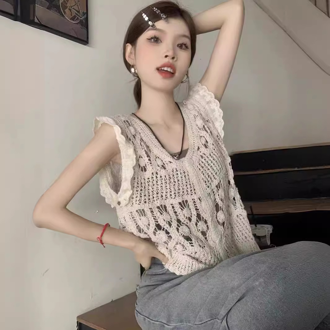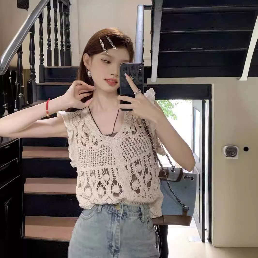 | nameOriginal | Hollow Crochet Knitted Blouse Women's Summer Thin Overlap Vest 2024 New Design V-neck Top |
