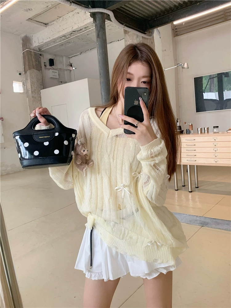 Hollow layered sun protection top with three-dimensional bow