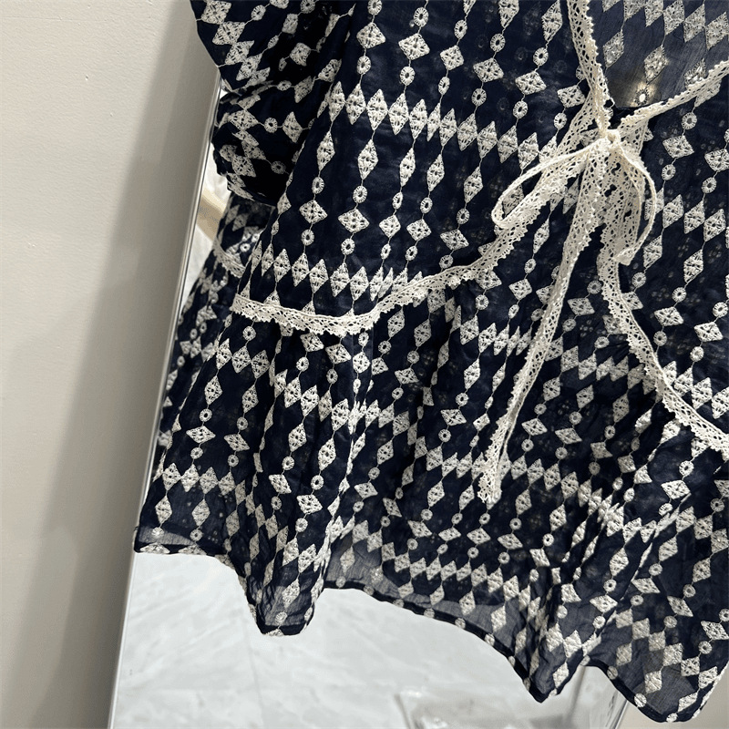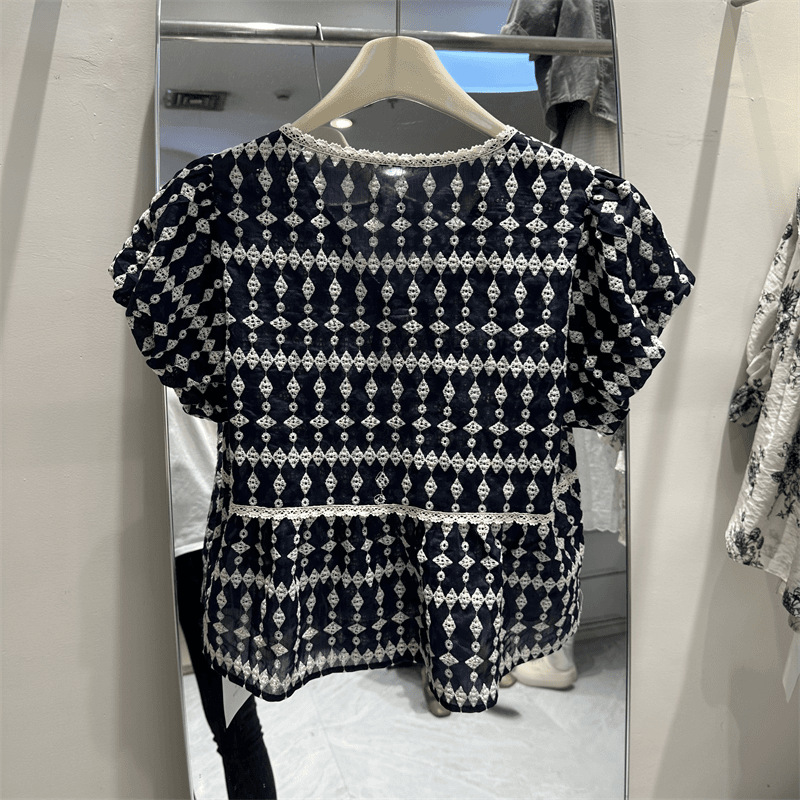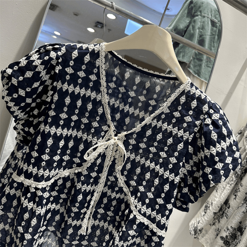 | nameOriginal | Hollow-out Embroidered Puff Sleeve Shirt Women's 2024 Summer Vintage Short-sleeved Shirt V-neck Lace-up Doll Shirt Western Style Small Shirt |