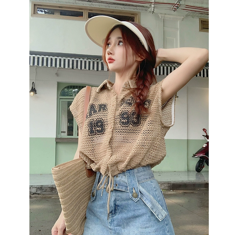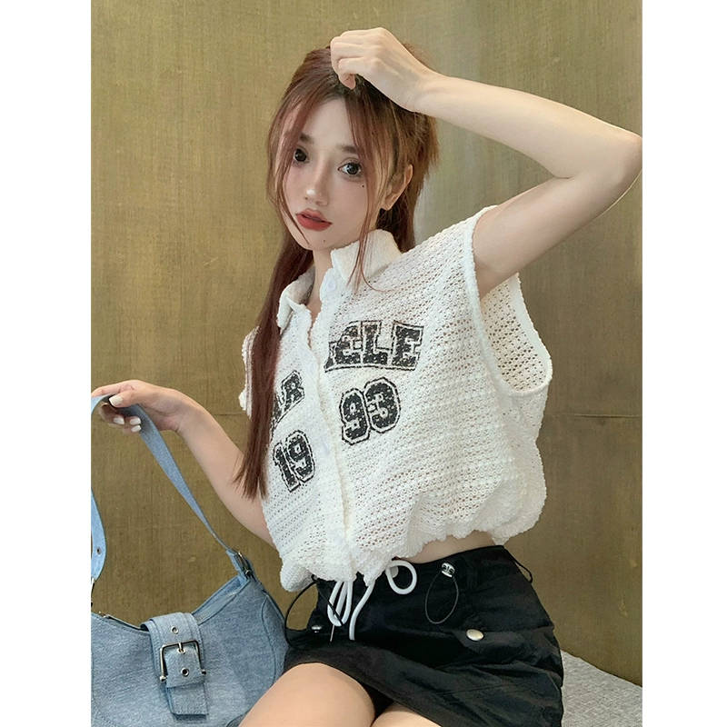 Hollow outer small cardigan knitted jacket with suspenders, women’s summer thin sleeveless drawstring short top, trendy