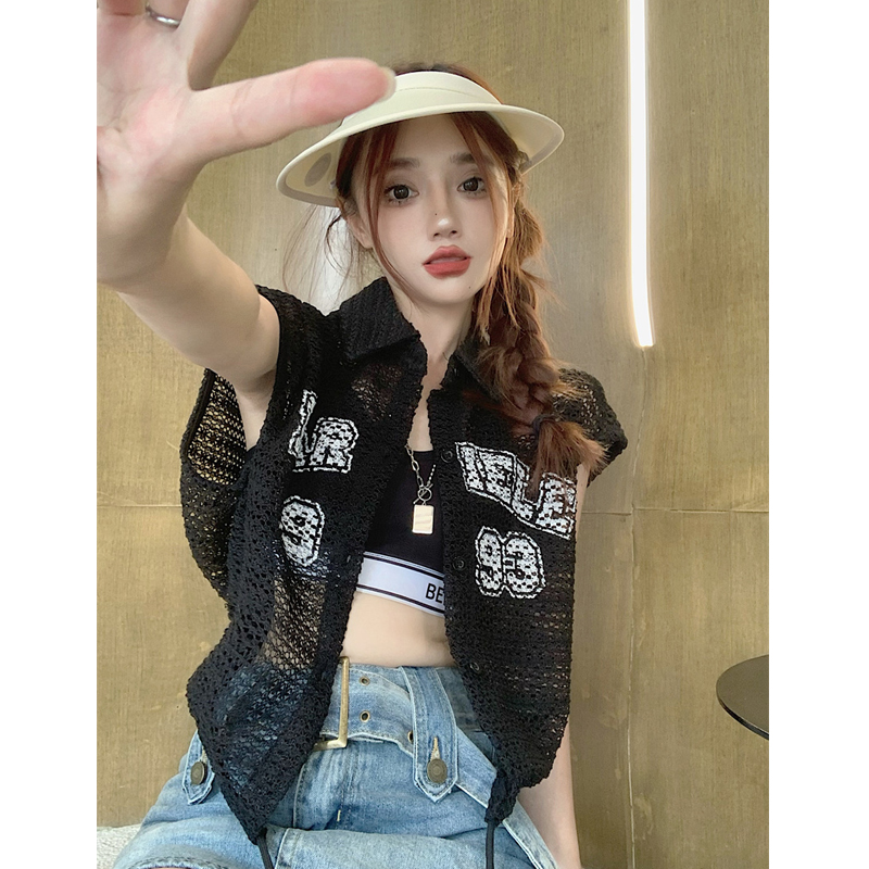 Hollow outer small cardigan knitted jacket with suspenders, women's summer thin sleeveless drawstring short top, trendy