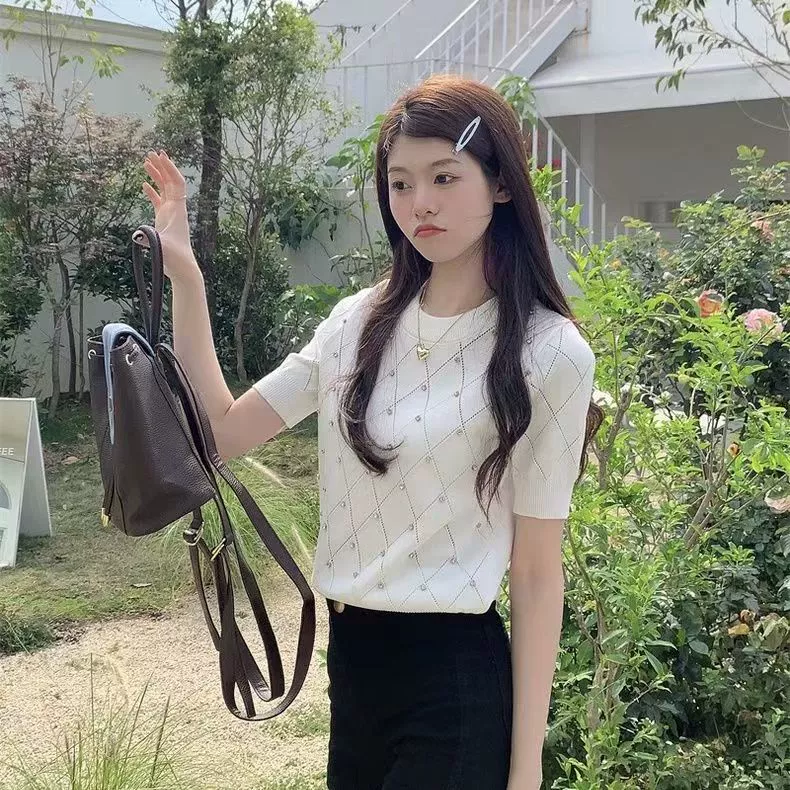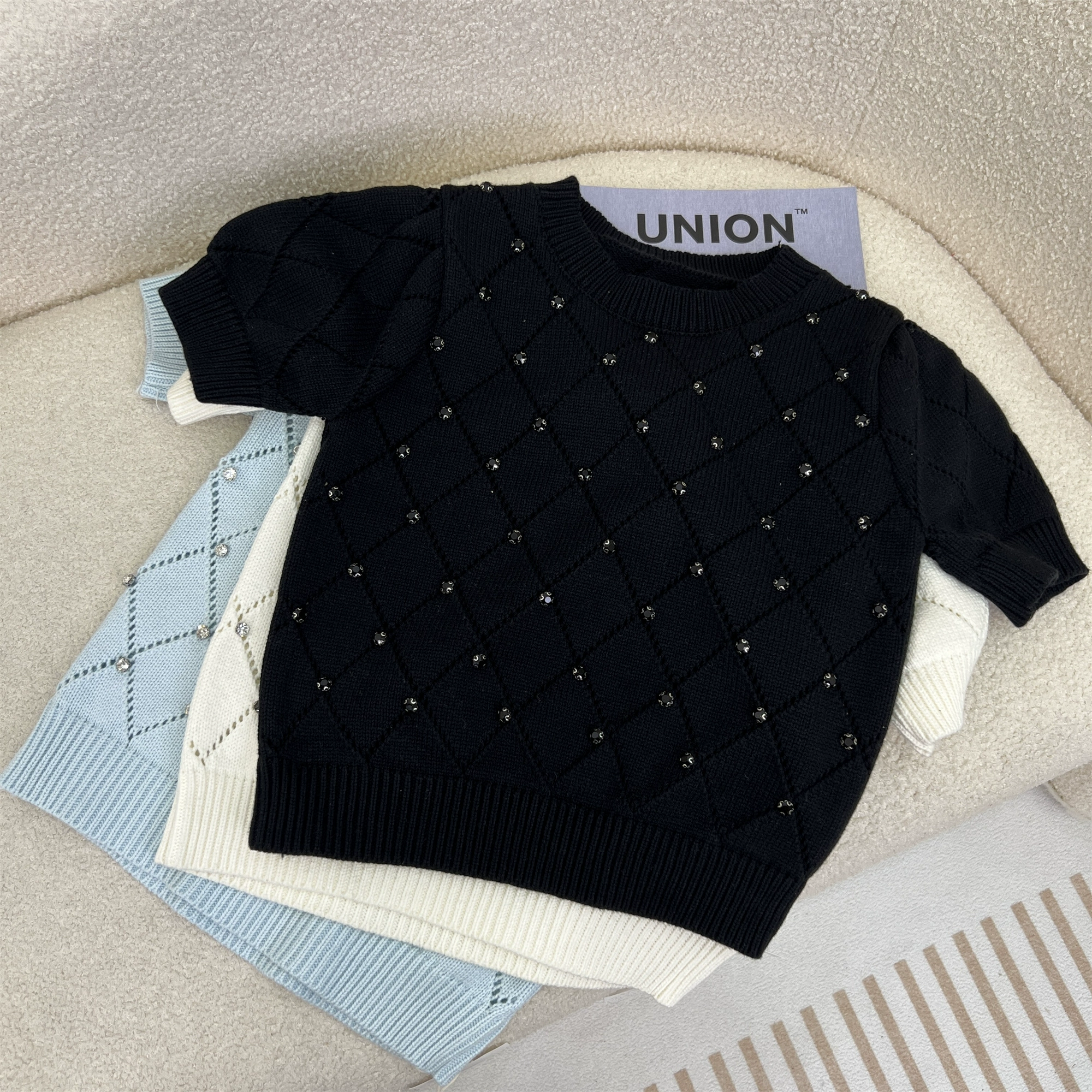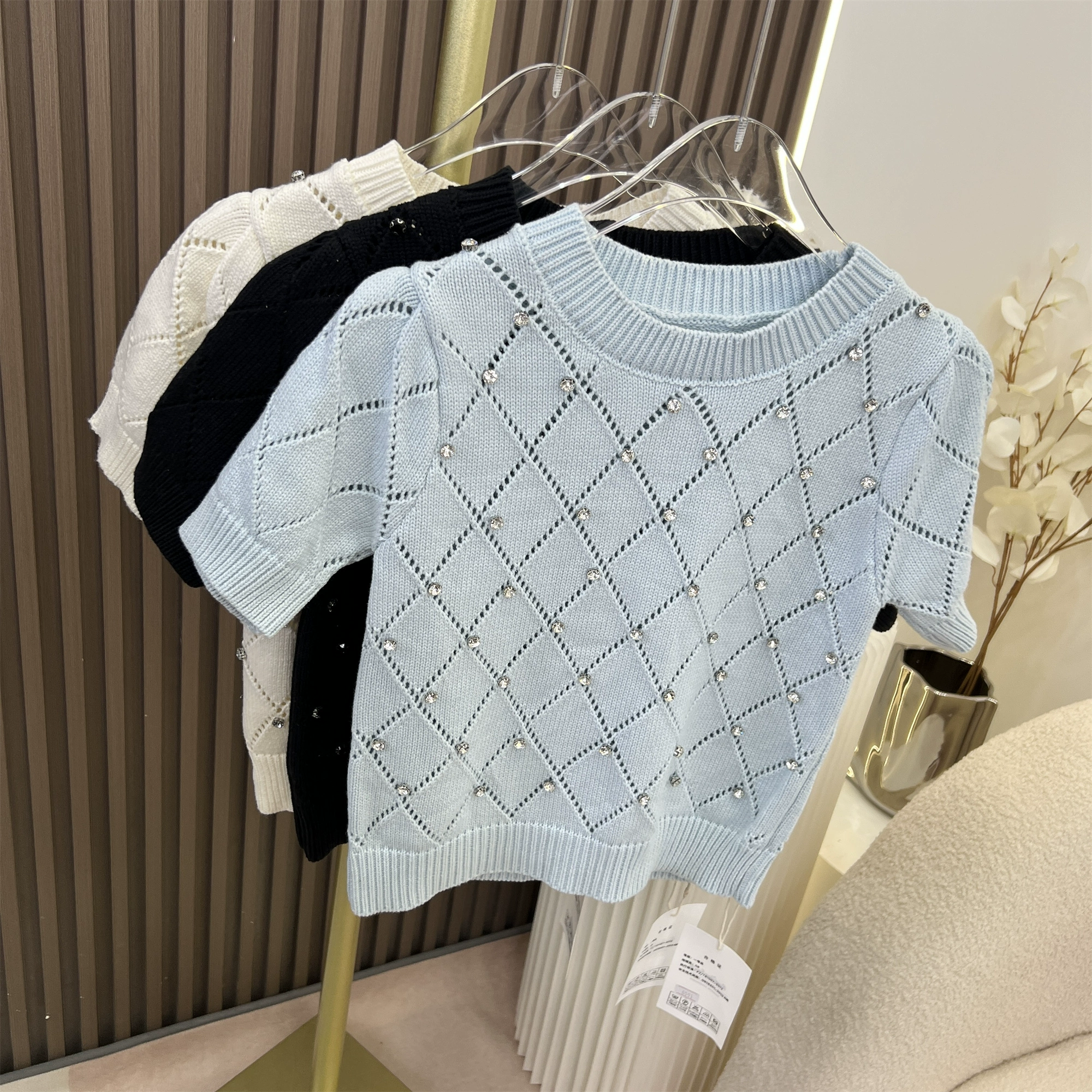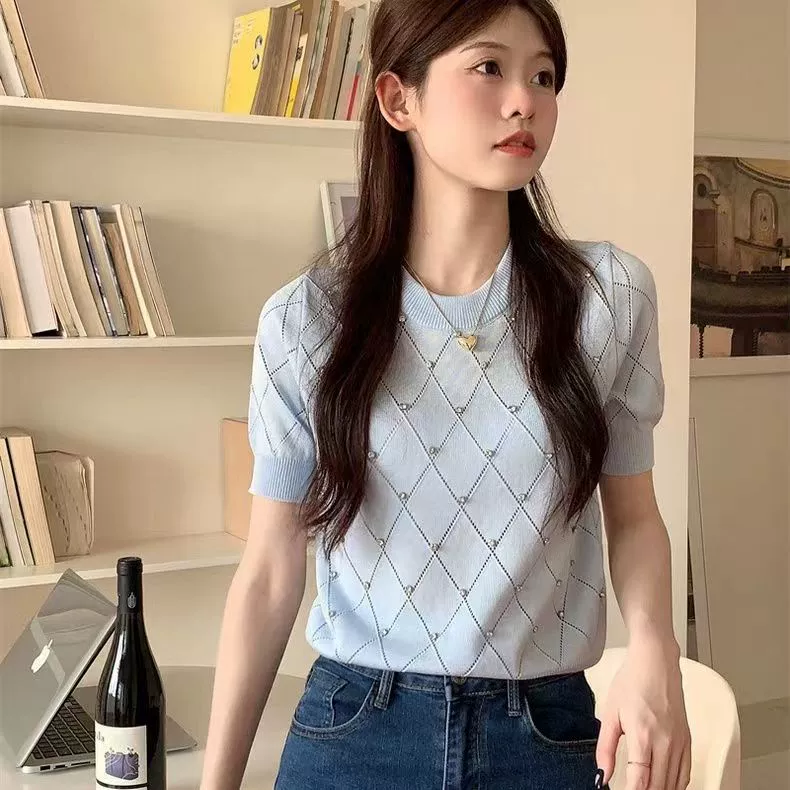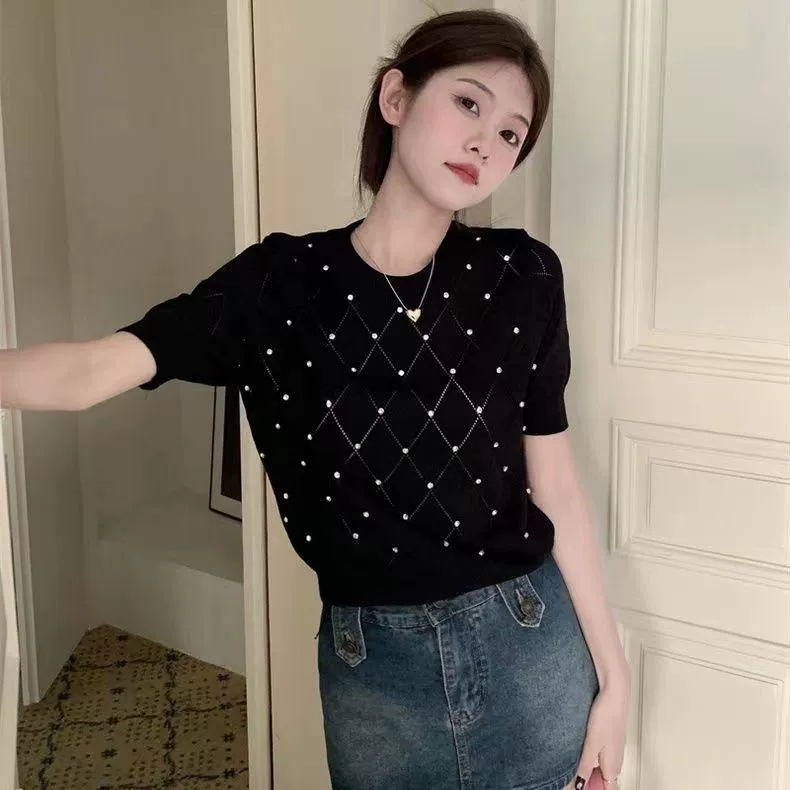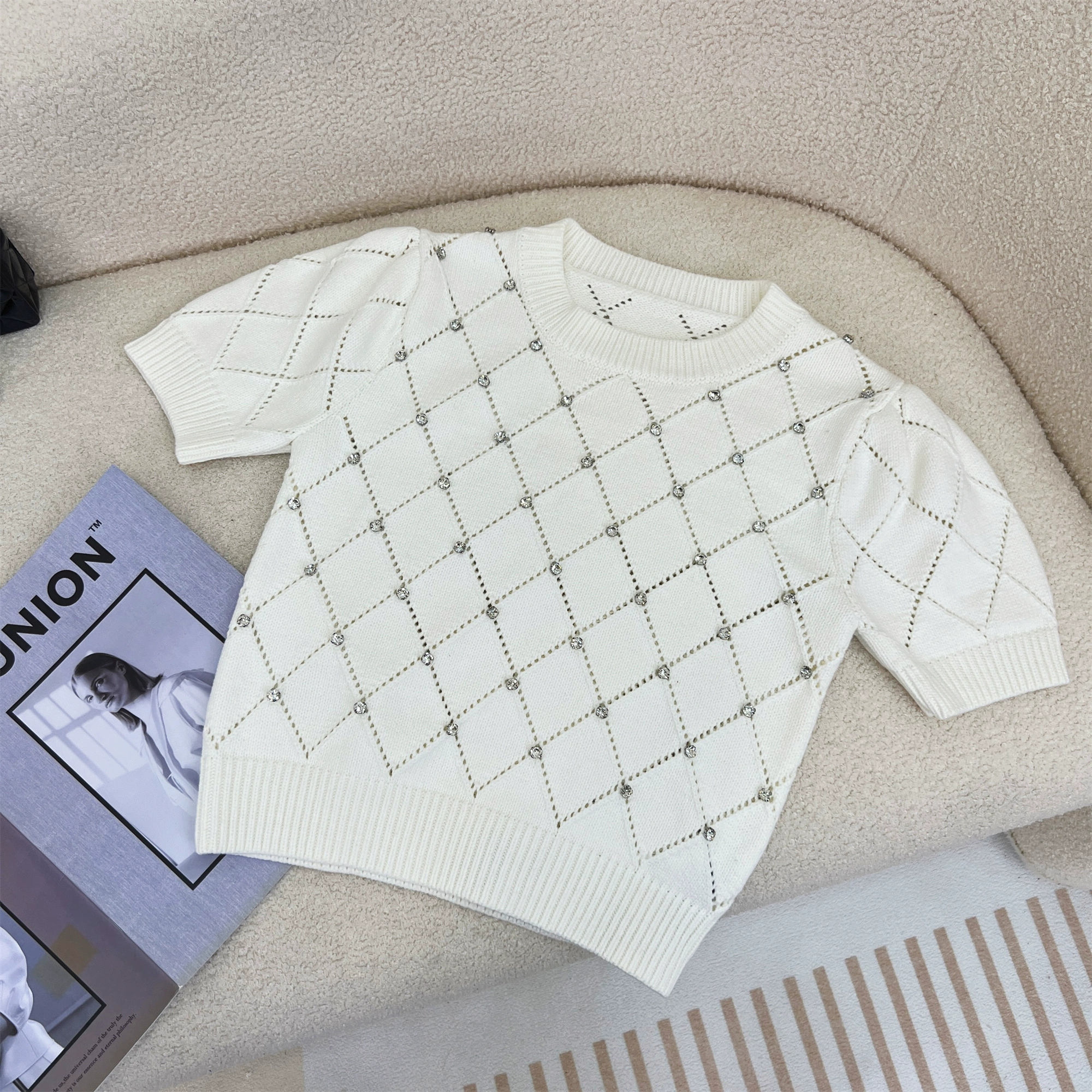| nameOriginal | Hollow plaid spring temperament round neck niche short sleeves |