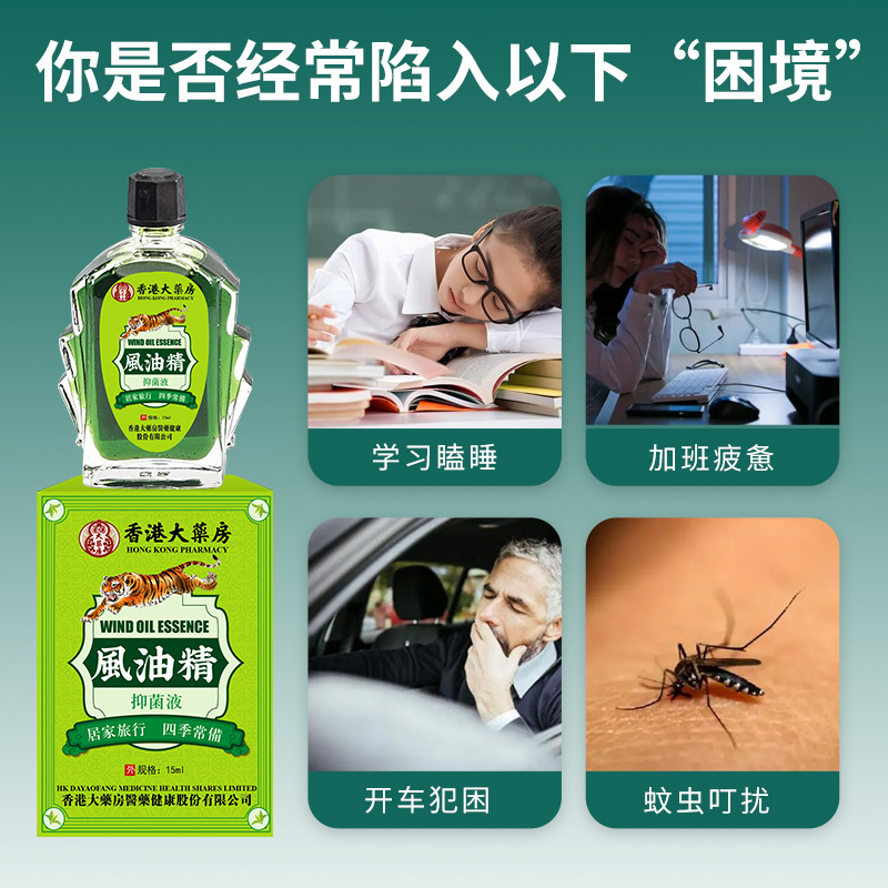 | nameOriginal | Hong Kong pharmacy wind Oil Essence 15ml refreshing refreshing cool anti-mosquito anti-itching anti-sleepy anti-carsickness staying up late Outdoor |