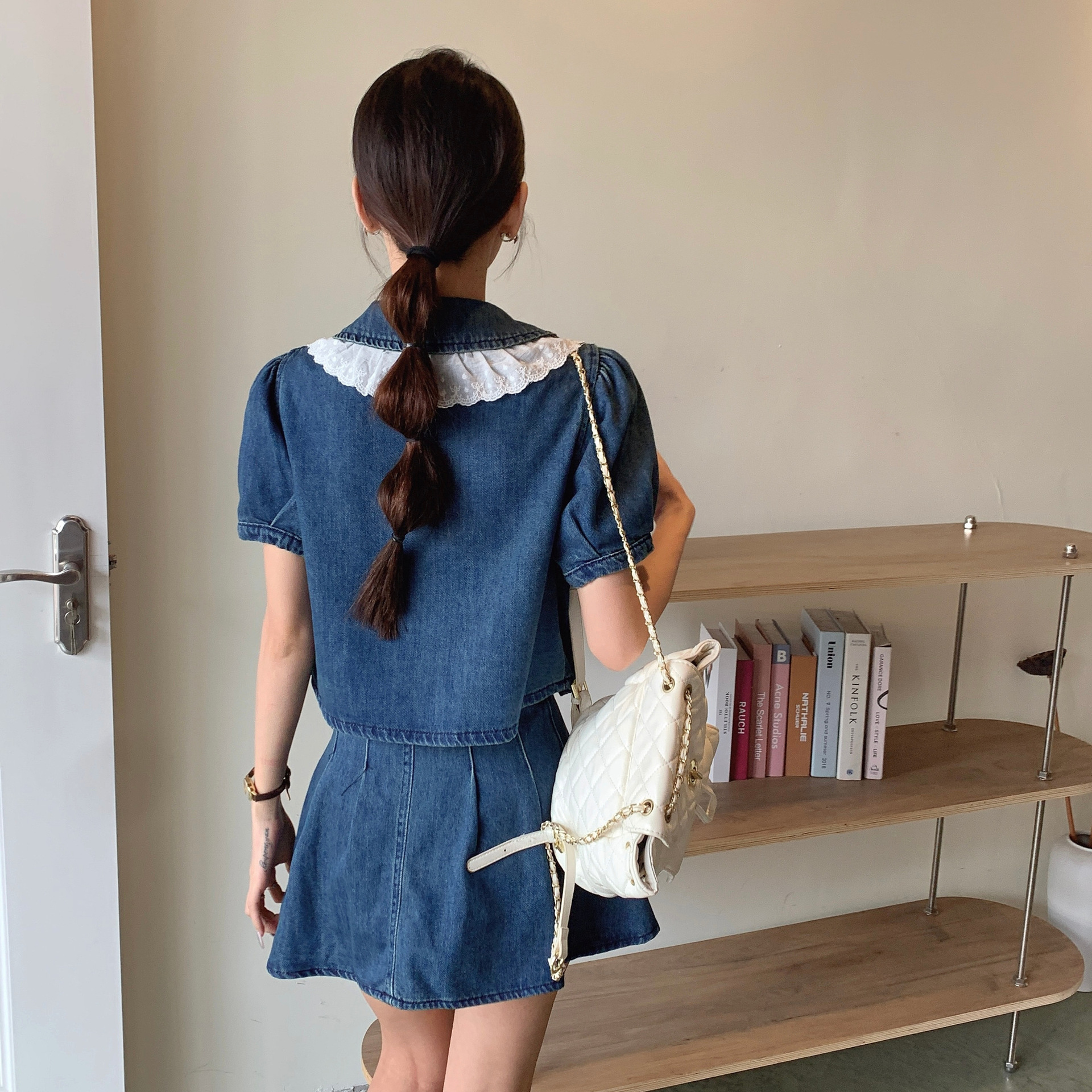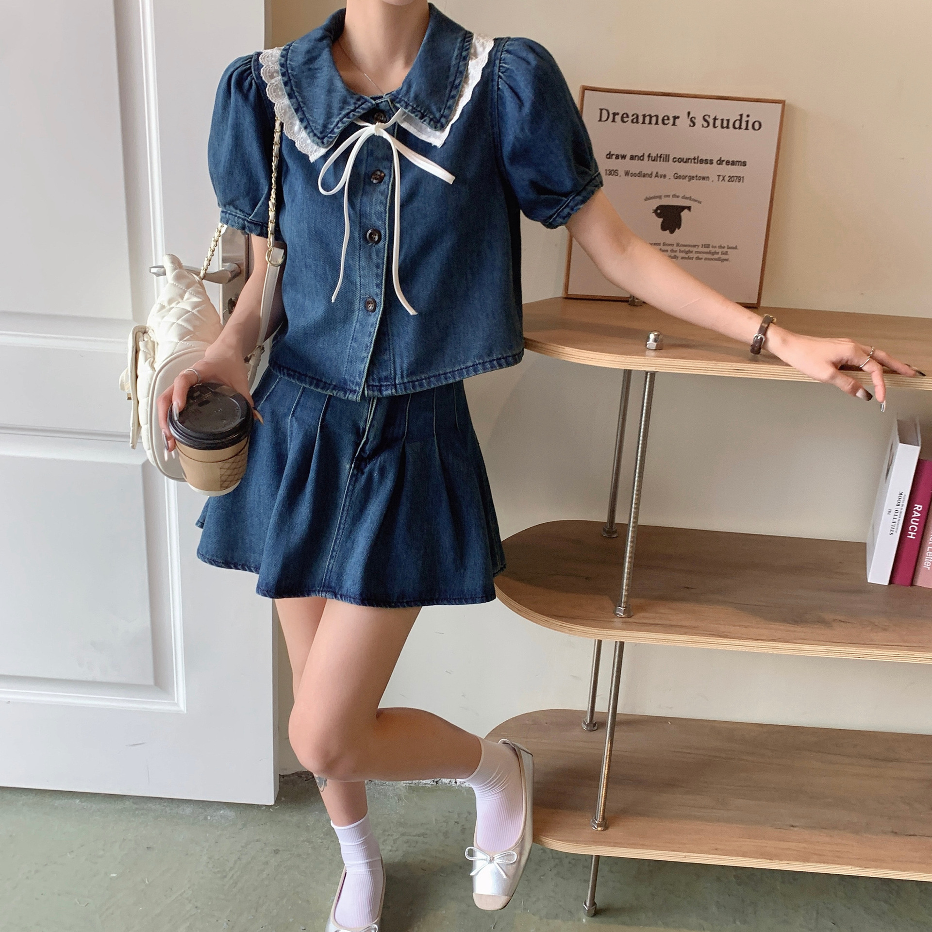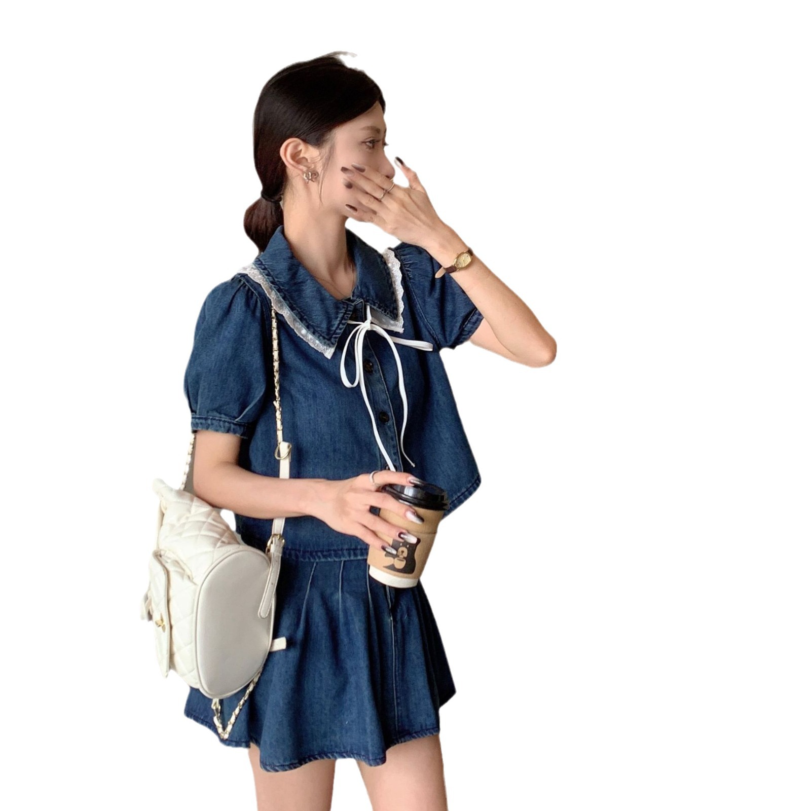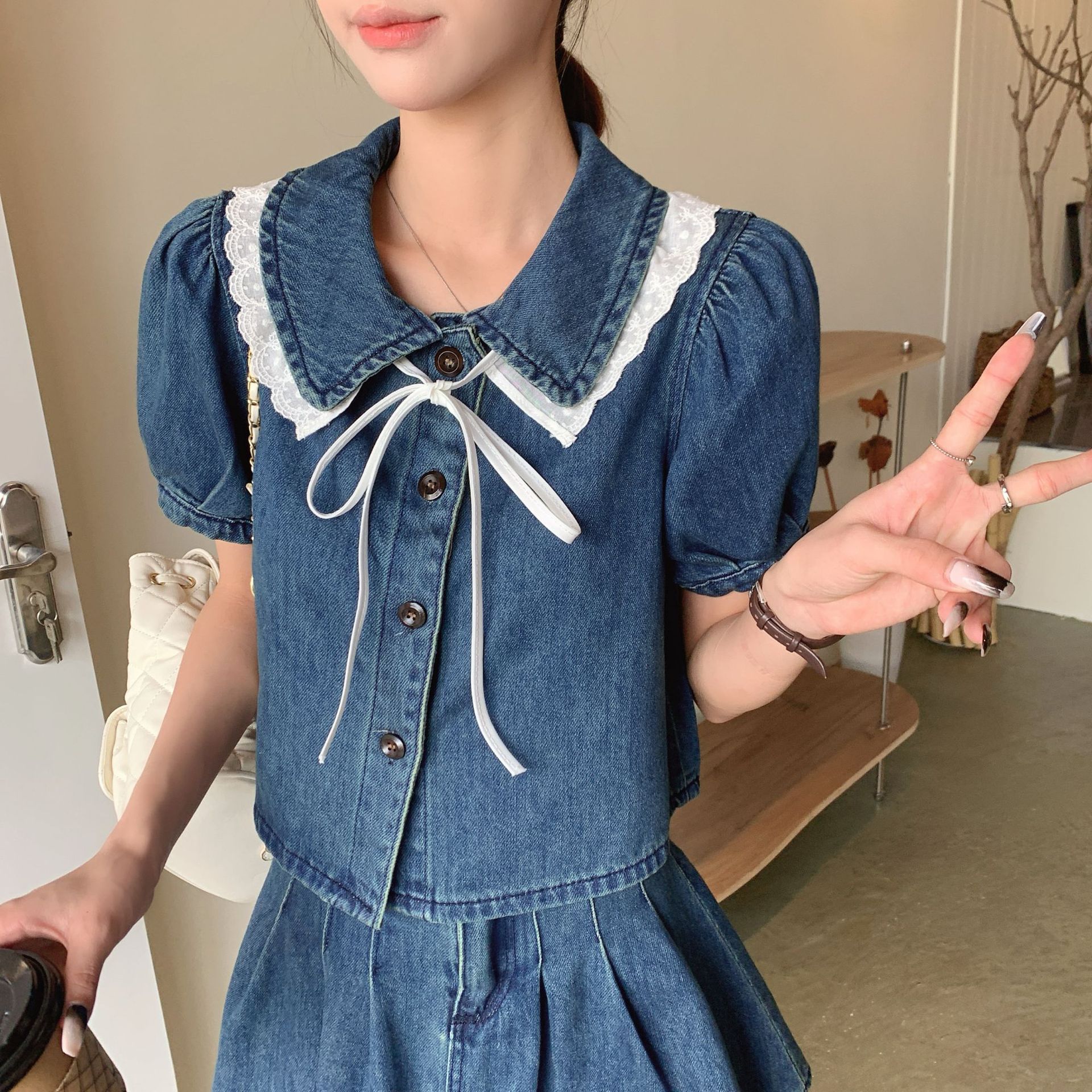 Hong Kong Style 2024 suit Women’s Summer New Doll Collar Bubble Short-sleeved Small Denim Top Half Short Skirt