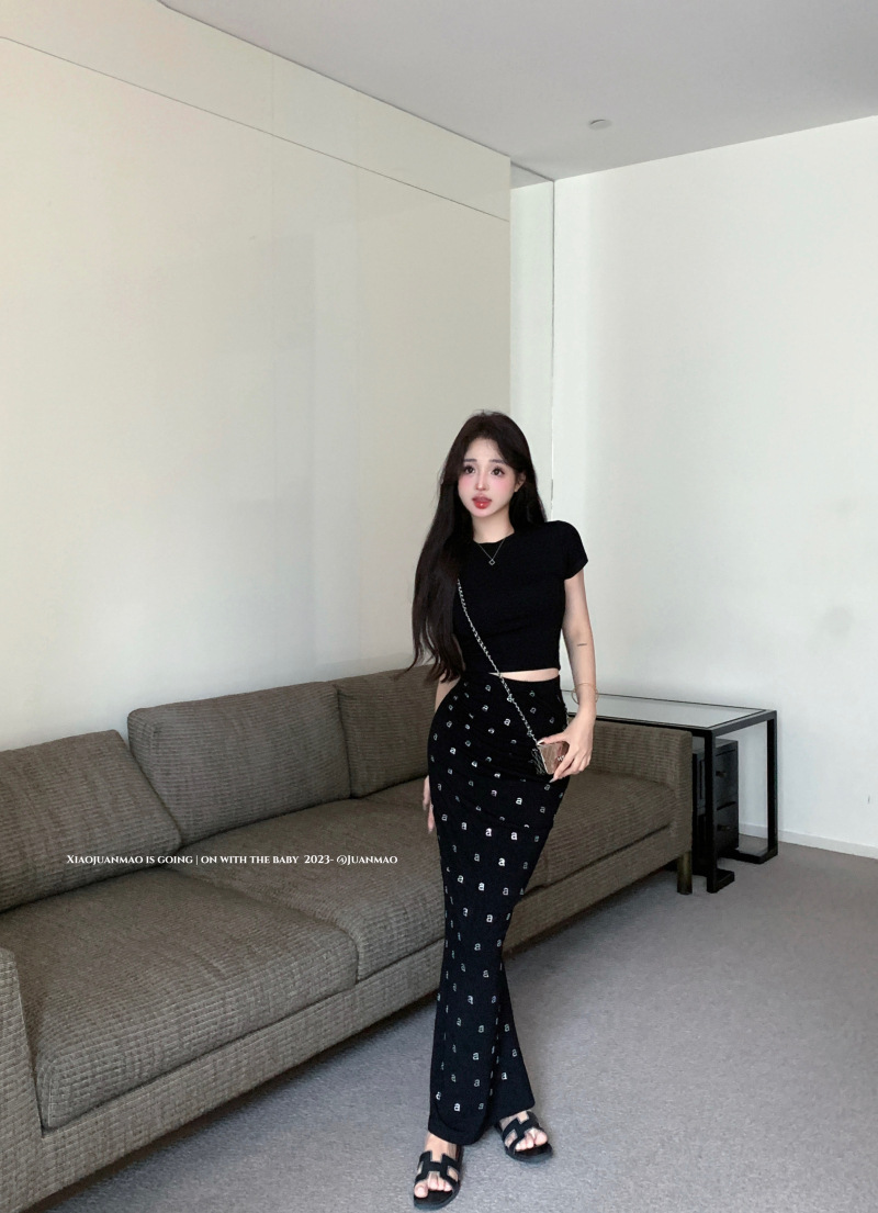 | nameOriginal | Hong Kong Style Black Crewneck Short-sleeved T-shirt Women's Summer Korean-style Pure Desire Letter Printed Fishtail Hip Skirt suit |