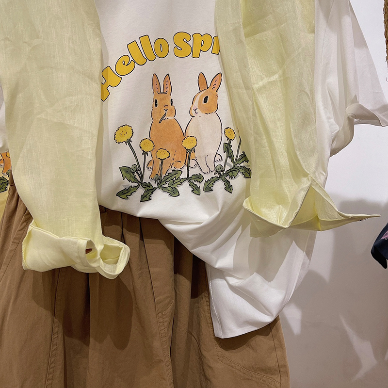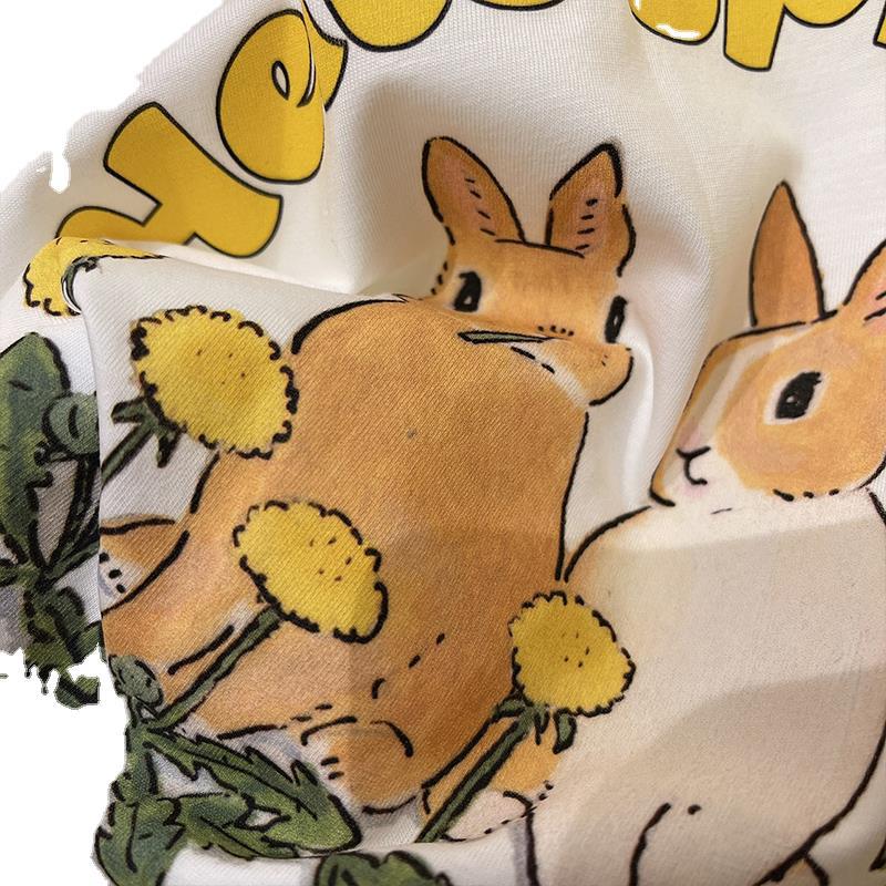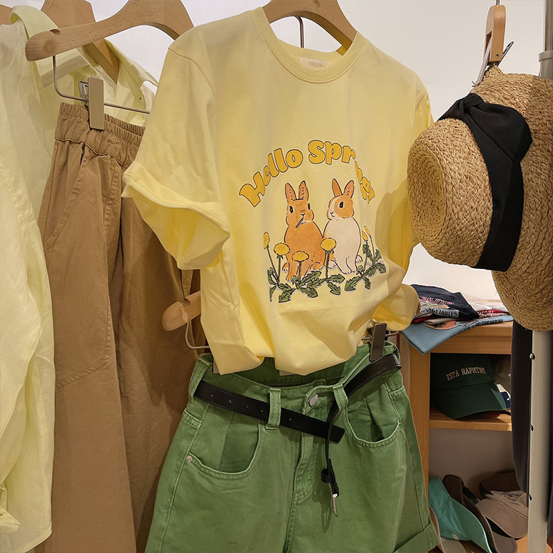 Hong Kong style chic fun rabbit crew neck short sleeve T-shirt women's 2024 spring and summer new all-match cotton shoulder clothes