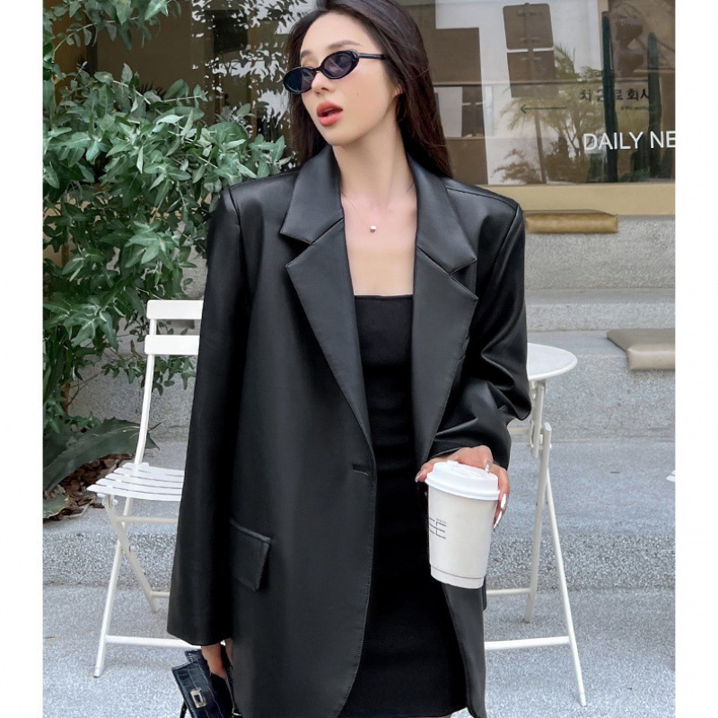 Hong Kong style leather suit jacket for women 2023 Spring and Autumn new textured fried street loose casual PU leather suit