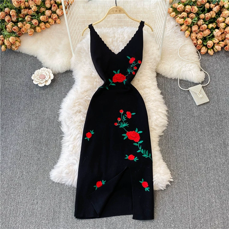 | nameOriginal | Hong Kong style retro black suspender dress with rose embroidery |