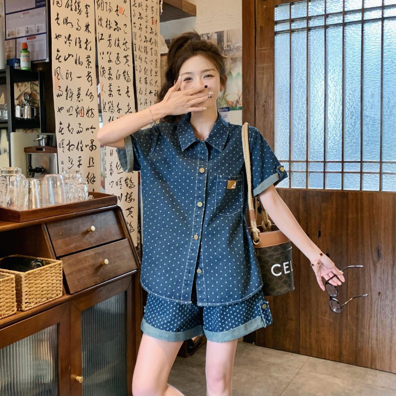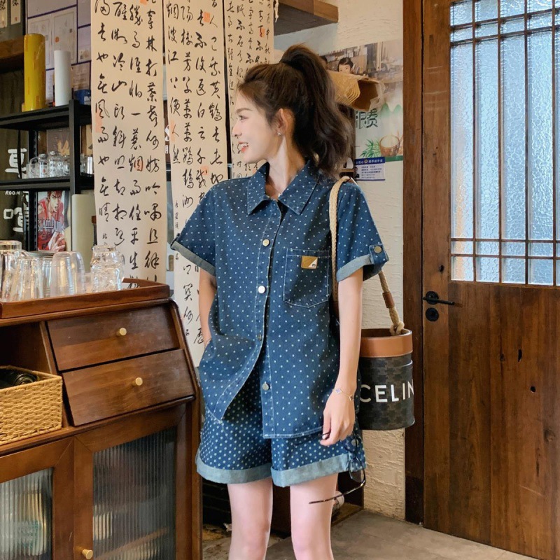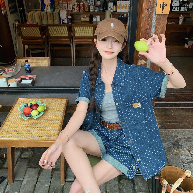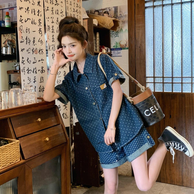 | nameOriginal | Hong Kong Style Retro Denim Wave Dot Fashion suit Summer Women's 2024 New Academy Style Loose Shirt and Shorts Two-piece Set |
