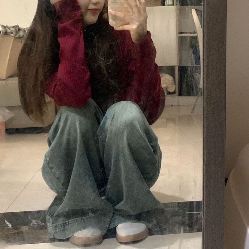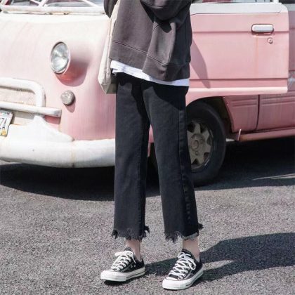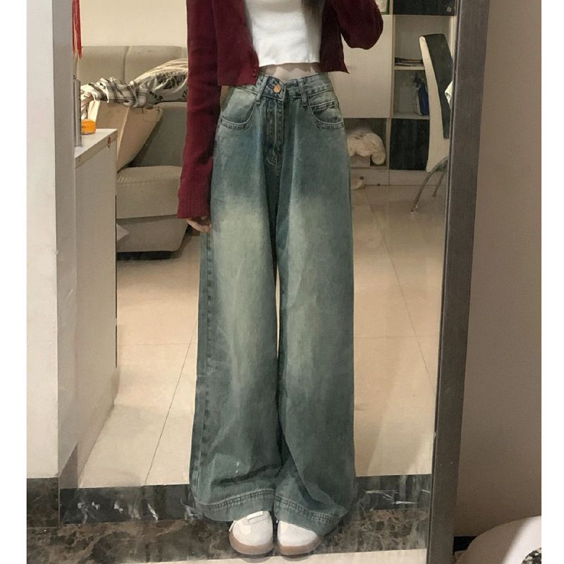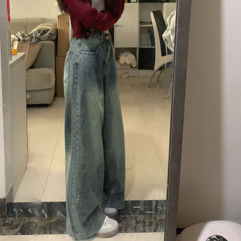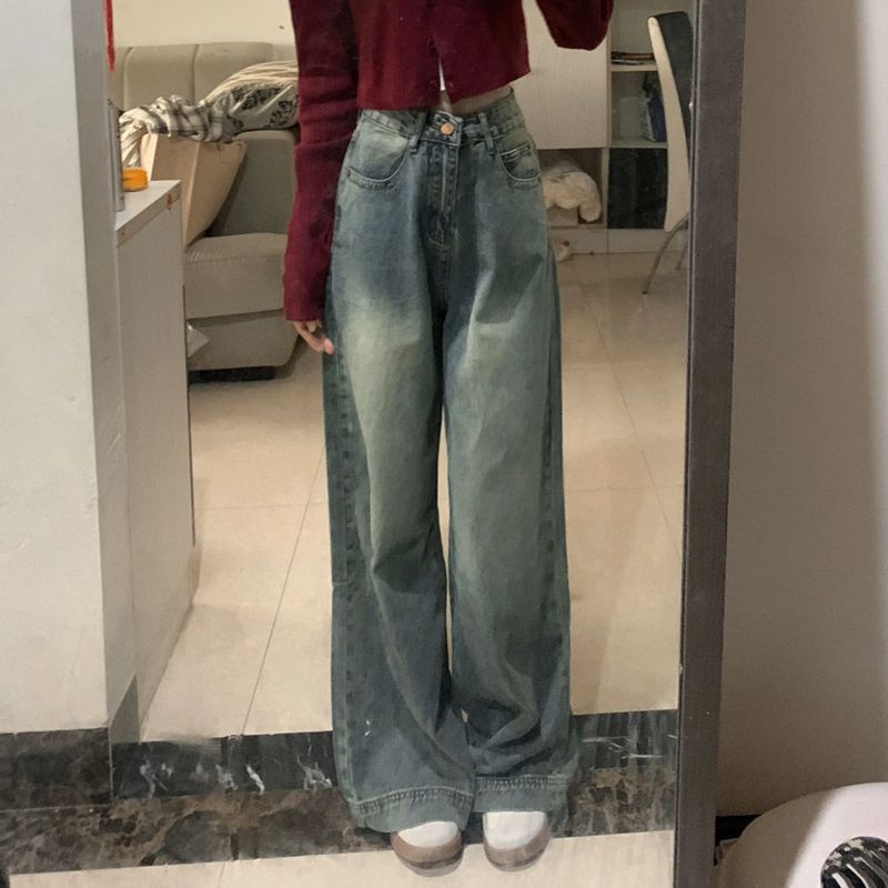 | nameOriginal | Hong Kong-style retro distressed straight jeans women's autumn short high waist slimming drape pants wide leg pants |