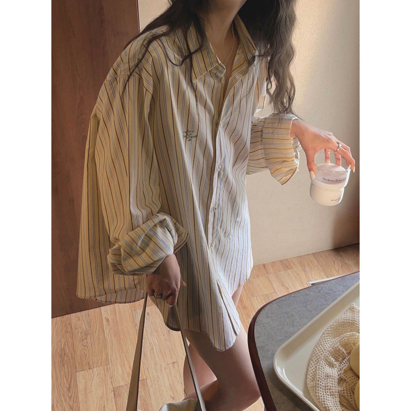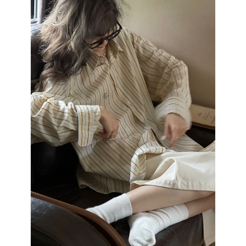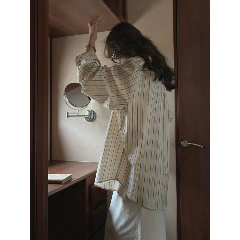 Hong Kong-style Retro Yellow Striped Long-sleeved Shirt Women’s Loose 2024 Spring Inner Stacked Couples Shirt Top