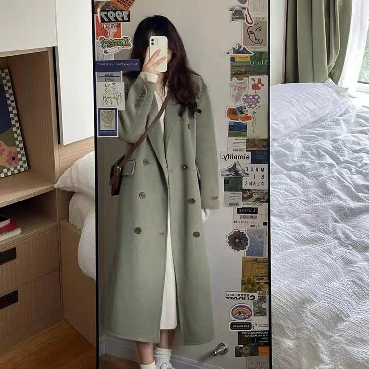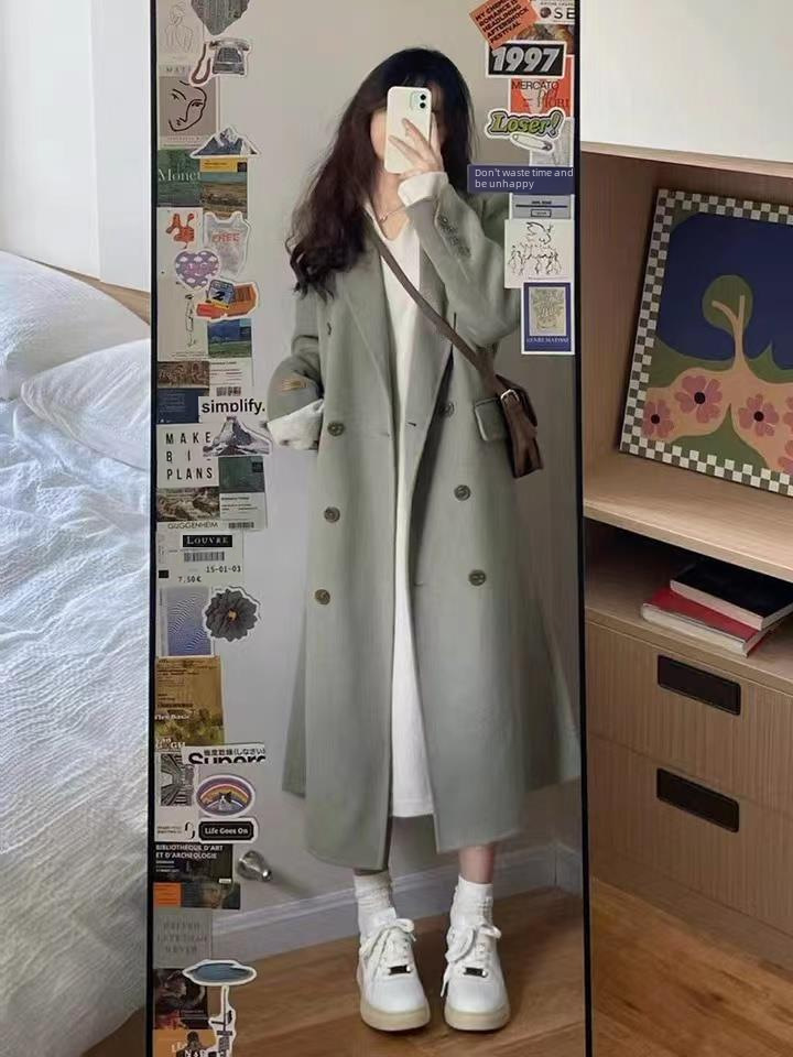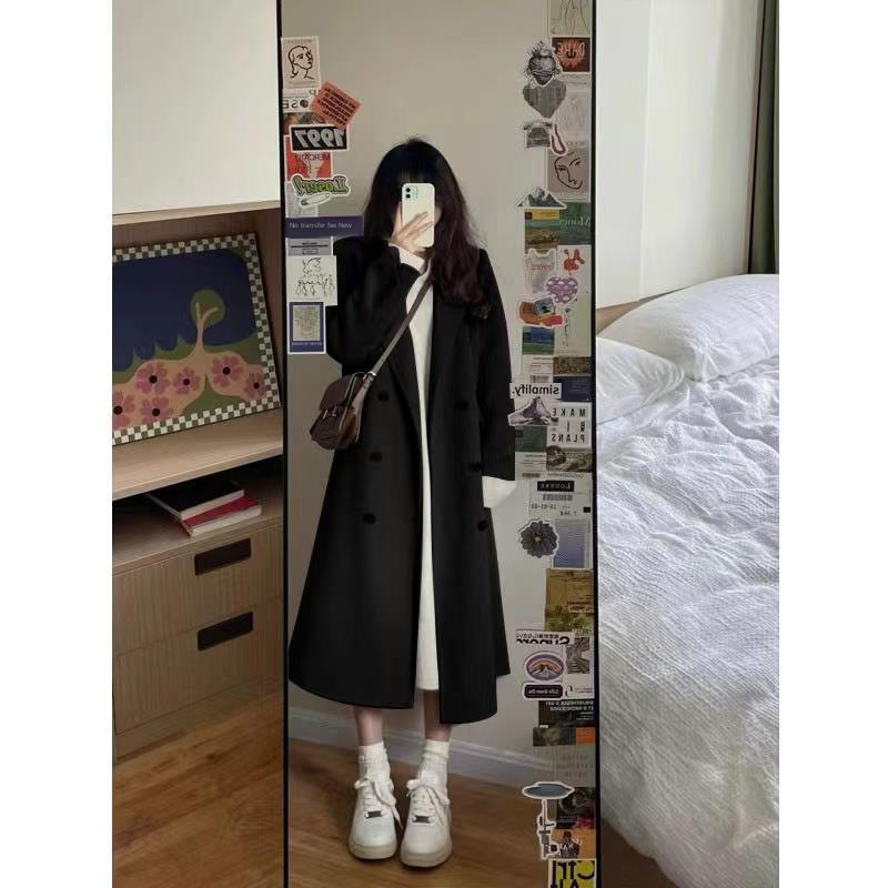 Hong Kong style solid color mid-length woolen trench coat for female students autumn and winter Korean style Hepburn style loose warm coat