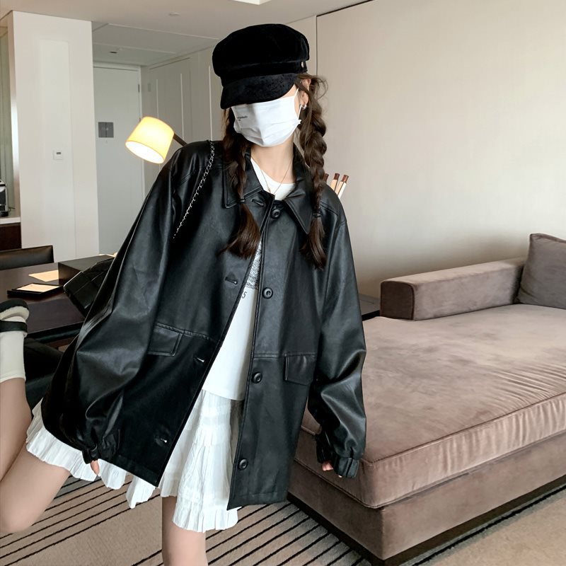 | nameOriginal | Hong Kong Style Vintage Black Leather Jacket Women's 2024 Spring and Autumn New Arrival Loose Casual Short PU Leather Jacket |