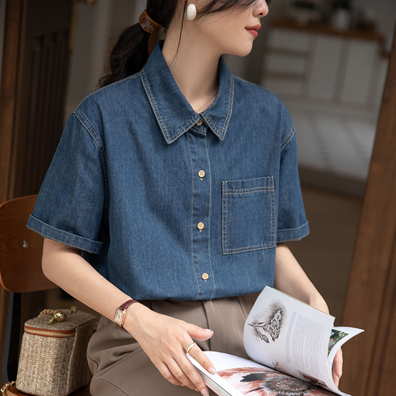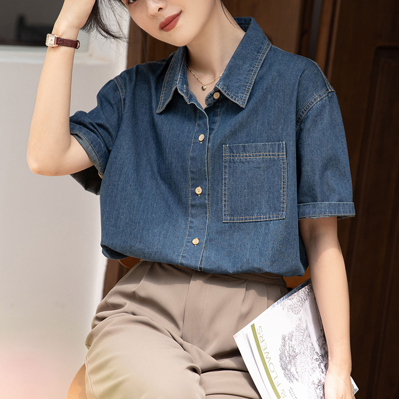 | nameOriginal | Hong Kong Style Vintage Loose Blue Short-sleeved Denim Shirt Women's 2024 New Style Small Shirt Women's Elegant Top |